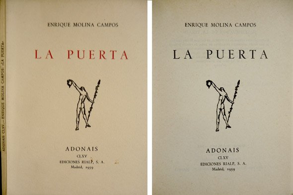 Madrid, 1959 ["Adonais"]. 8vo.; 64 pp., 2 hs. Edición limitada de 600 ejemplares. Cubiertas originales.