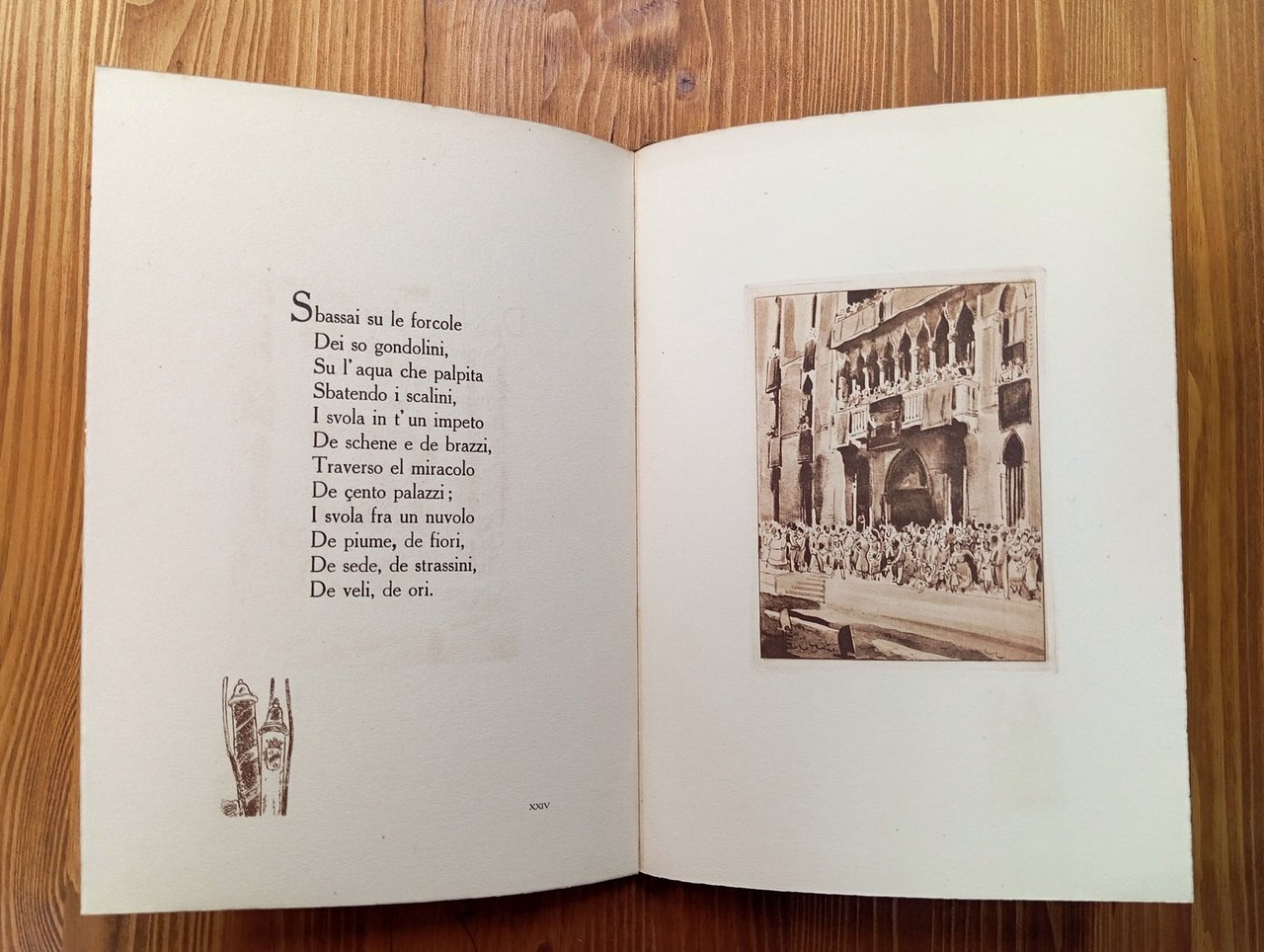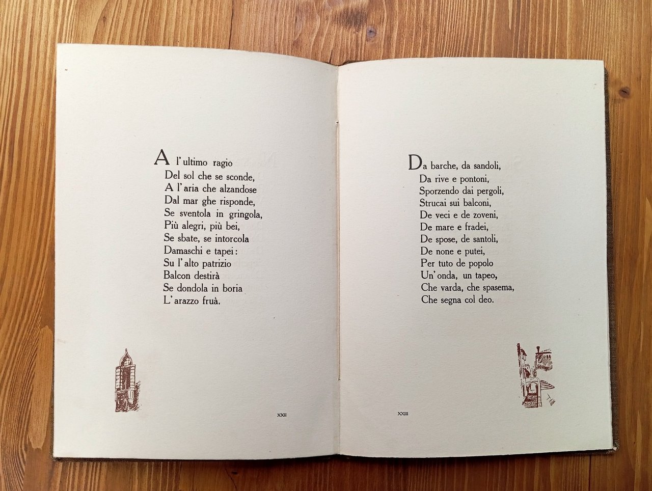 Edizione di 100 esemplari numerati dall'1 al 100, il nostro è il n. 14. Concessione speciale della casa Treves dall'opera "Commedie e poesie veneziane" di Riccardo Selvatico. Senza data di stampa, ma post-1910 - Volume rilegato in piena tela editoriale con titolo e fregio in oro al piatto anteriore, XXXII pagine intercalate da graziose tavoline illustrate in tonalità seppia. Prefazione di Guido Marta. Esemplare in ottime condizioni di questa elegante edizione per collezionisti.