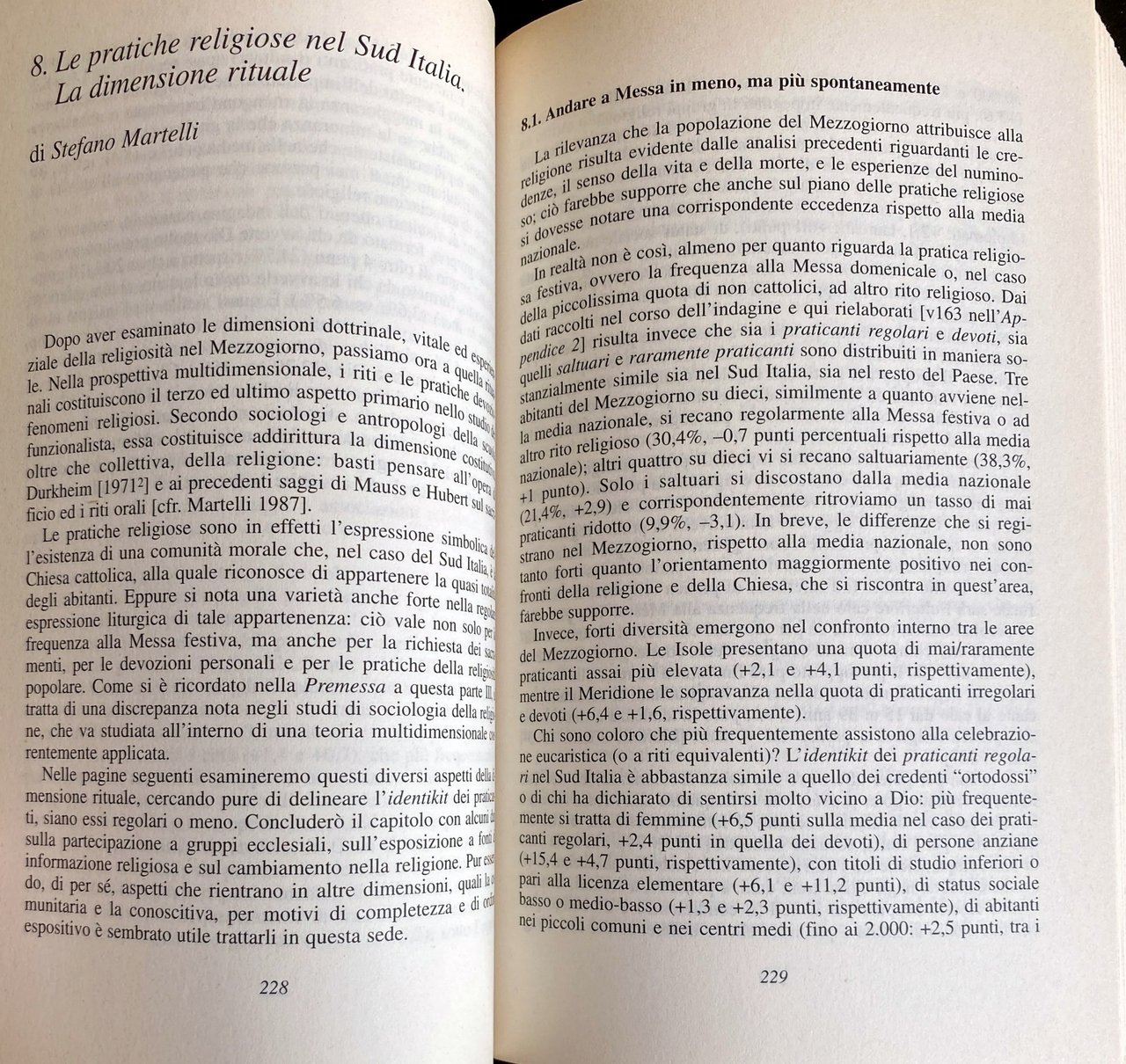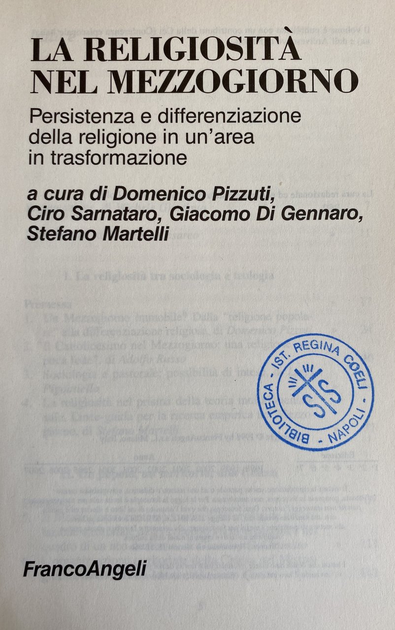 - Religiosità, Sociologia, Teologia, Italia meridionale, Sud, Religione, Cattolicesimo, Fede, Chiesa, Pratiche religiose, Riti, Rituali, Credenze, Appartenenza religiosa, Politica, Partecipazione, Tempo libero, Tradizione, Questionari, Inchieste, Saggistica, Documenti, Consultazione, Libri fuori catalogo, Ateismo, Laicismo, Feste, Processioni, Pellegrinaggi, Devozione, Culti, Santi, Venerazione, Immagini sacre, Vita quotidiana, Tradizioni popolari, Relazioni, Messa, Sacramenti, Altre confessioni, Altre religioni, Secolarizzazione, Cambiamenti sociali, Urbanizzazione, Emigrazione, Istruzione, Globalizzazione, Società, Scienze sociali, Antropologia culturale, Comportamento