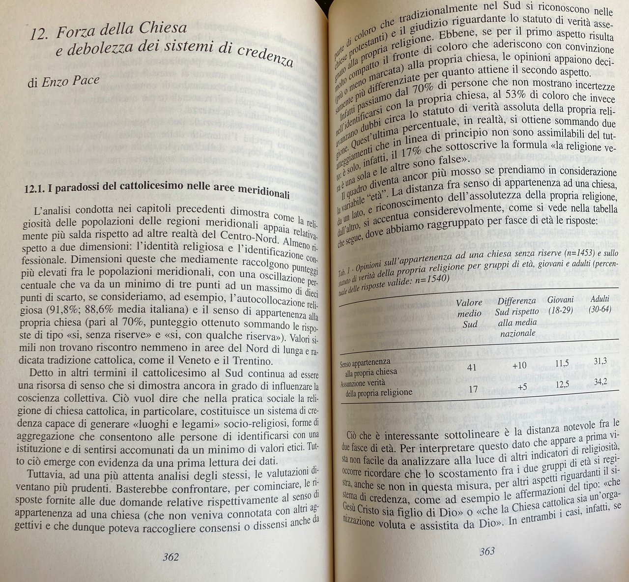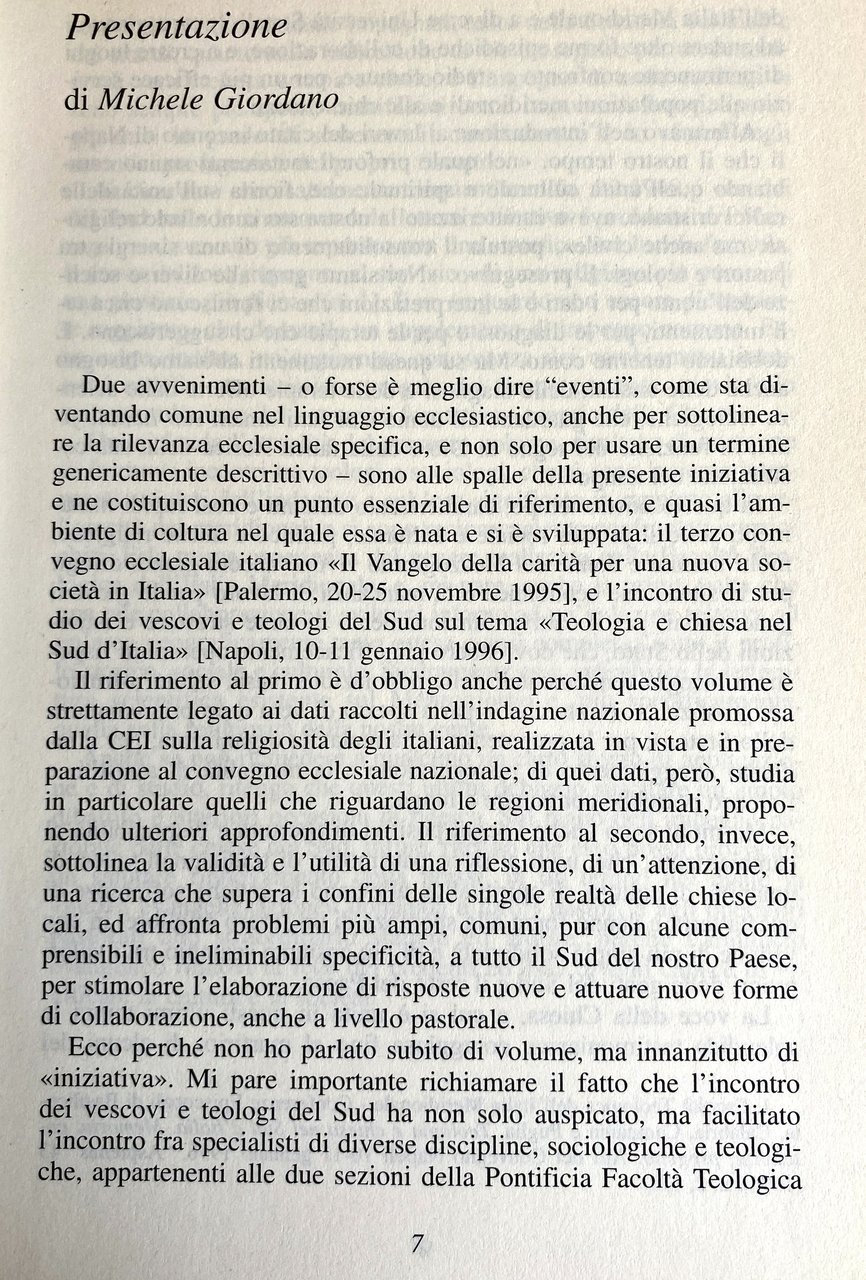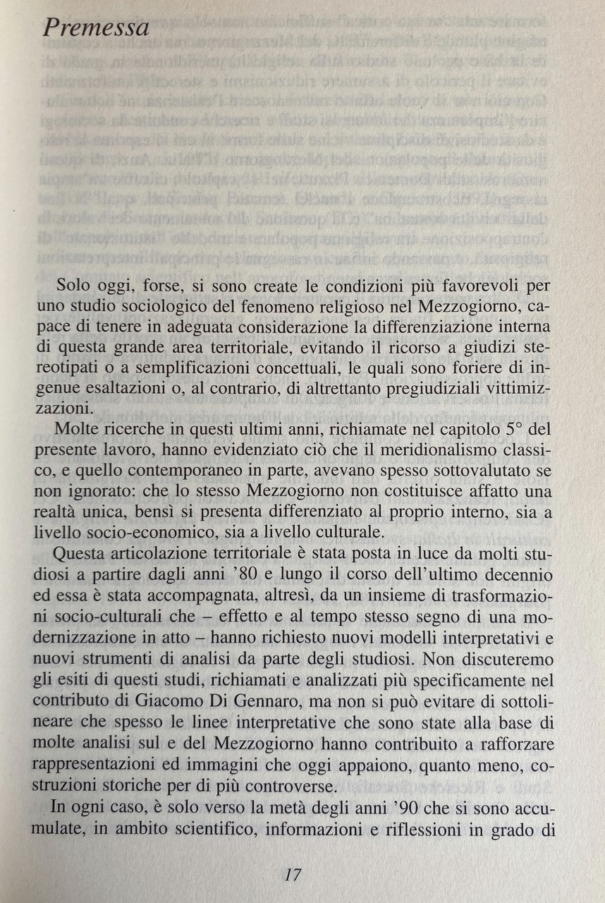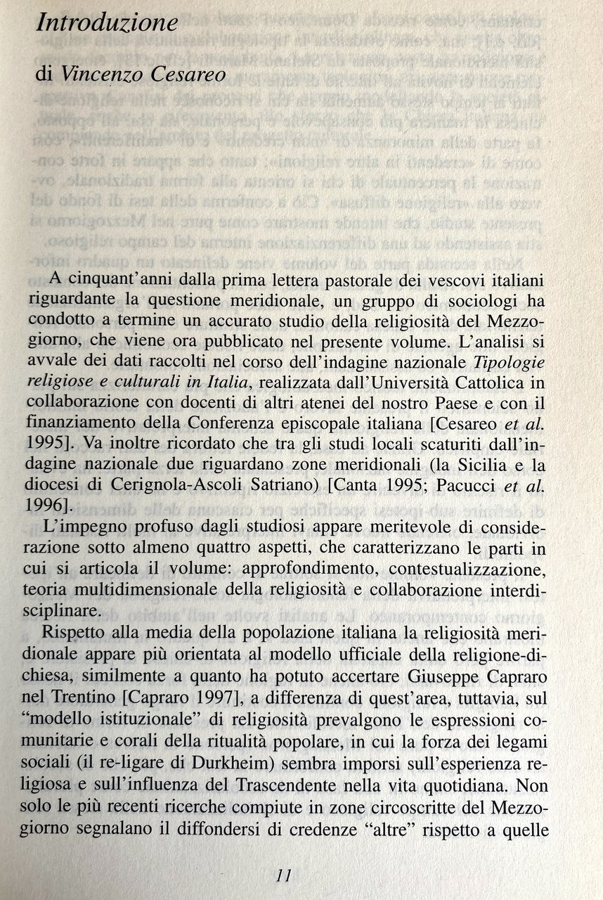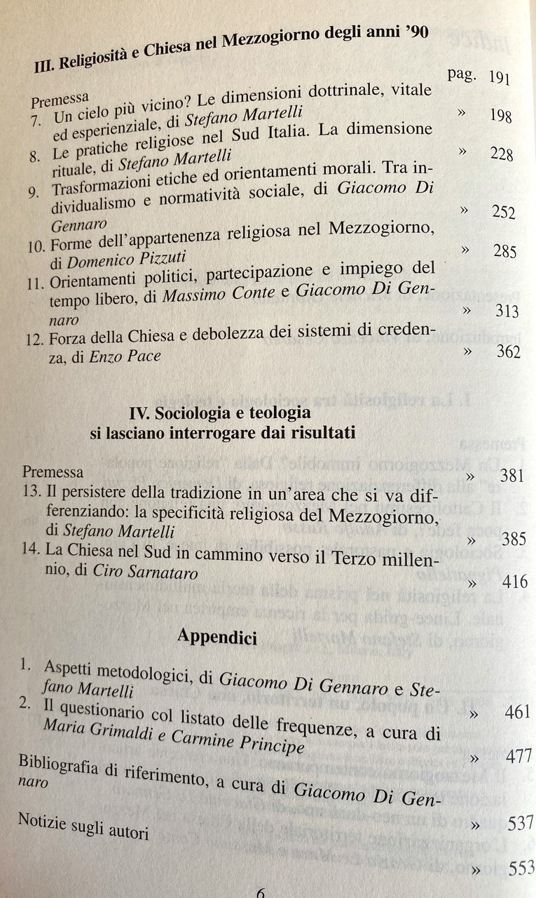 Soggetti: Religiosità Sociologia Teologia Italia Sud Religione popolare Cattolicesimo Fede Pastorale Territorio Chiesa Sviluppo socio-economico Dottrina Pratiche religiose Riti Rituali Credenze Individualismo Normatività sociale Appartenenza religiosa Politica Partecipazione Tempo libero Tradizione Appendici Questionario Frequenze Inchieste Bibliografia Riferimento Saggistica Documenti Consultazione Libri rari fuori catalogo CEI Conferenza episcopale Sicilia Campania Calabria Puglia Basilicata Lucania Durkheim Ateismo Laicismo Feste Processioni Pellegrinaggio Devozione Culto Santi Venerazione Immagini sacre Vita quotidiana Tradizioni Valori Relazioni Famiglia Pratica Giovani Messa Sacramenti Eurispes Altre confessioni Secolarizzazione Cambiamenti Urbanizzazione Emigrazione Istruzione Globalizzazione Mass Media Calo Vocazioni Società Scienze sociali Gesuiti Napoli Parrocchie Preti Strada Ragazzi Oratorio Gigli Nola Pompei Antropologia culturale Classi subalterne Cocullo Comportamento Comunione Comunità Contesto Credenti Cristo Morte Pianto Lamento funebre Funerali Prefiche Terra del rimorso Parentela Contadini Cristologia Critica Cultura locale Fenomeni religiosi Folklore Gesù Lombardi Satriani Lanternari Liturgia Magia Manifestazioni Meligrana Nesti Dio Poveri Preghiera Madonna Maria Miracoli Questione meridionale Salvezza Santuari Studi Liberazione Torino Vallepietra Vangelo Vescovi Rossi-Doria Ruini Sciolla Simmel Weber Trigilia Parsons Pacucci Piselli Putnam Luhmann Lanzetti Martelli Galasso Garelli Giddens Istat Habermas Gribaudi Gramsci Crespi Ernesto De Martino Cipolla Censis Burgalassi Annuario Donne Disoccupazione Immigrati Islam Etica Ricoeur Sittlichkeit Ricolfi Praticanti Devoti Testimoni di Geova Protestanti Extracomunitari Africani Buddisti Singles Divorzio Trentino Divario Nord Mediazione Meditazione interiore Anziani Università Cattolica Catechismo Matrimonio religioso Ardigò Civiltà contadina Religiosity Sociology Theology Southern Italy Popular religion Catholicism Faith Pastoral Territory Church Socio-economic development Doctrine Religious practices Rites Rituals Beliefs Individualism Normativity Belonging Politics Participation Free time Tradition Appendices Questionnaire Frequencies Surveys Bibliography Reference Essays Documents Consultation Rare books out of print Episcopal Conference of Sicily Atheism Secularism Feasts Processions Pilgrimage Devotion Cult Saints Veneration Sacred images Daily life Traditions Values Relationships Family Practice Young people Sacraments Other confessions Secularization Changes Urbanization Emigration Education Globalization Decline in Vocations Society Social sciences Jesuits Naples Parishes Priests Street Boys Oratory Pompeii Cultural anthropology Subaltern classes Behavior Communion Community Context Believers Christ Death Weeping Funeral lament Funerals Mourners Land of remorse Kinship Peasants Christology Criticism Local culture Phenomena Jesus Liturgy Magic Manifestations God Poor Prayer Miracles Question Salvation Sanctuaries Studies Liberation Gospel Bishops Yearbook Women Unemployment Immigrants Ethics Practitioners Devotees Jehovah's Witnesses Protestants Non-EU citizens Africans Buddhists Divorce Northern Gap Mediation Interior meditation Elderly Catholic University Catechism Marriage Peasant civilization
