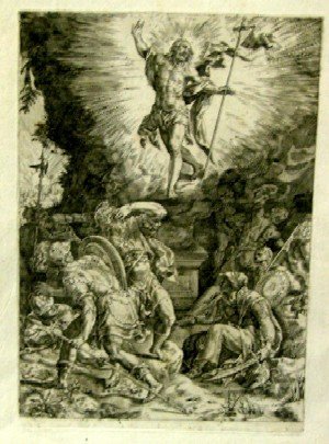 Incisione raffigurante Gesù risorto con ai piedi diversi soldati, su foglio di cm 47 x 34, parte incisa di cm 31 x 22.