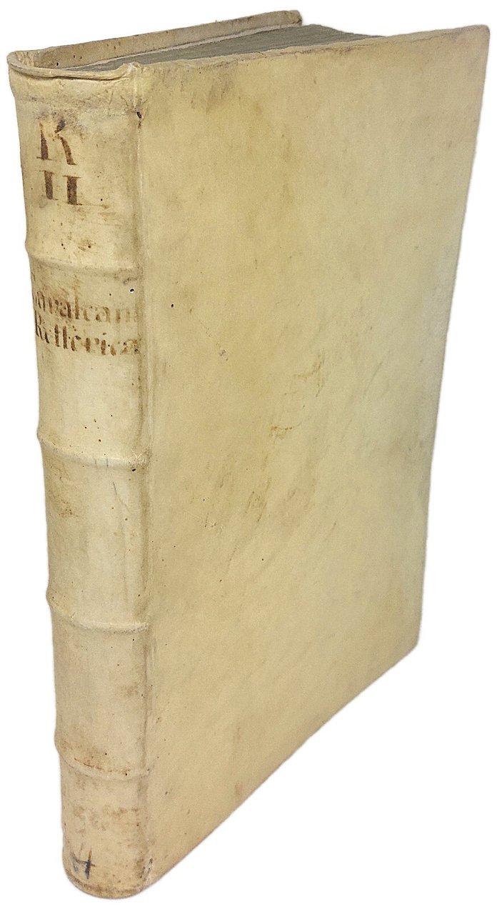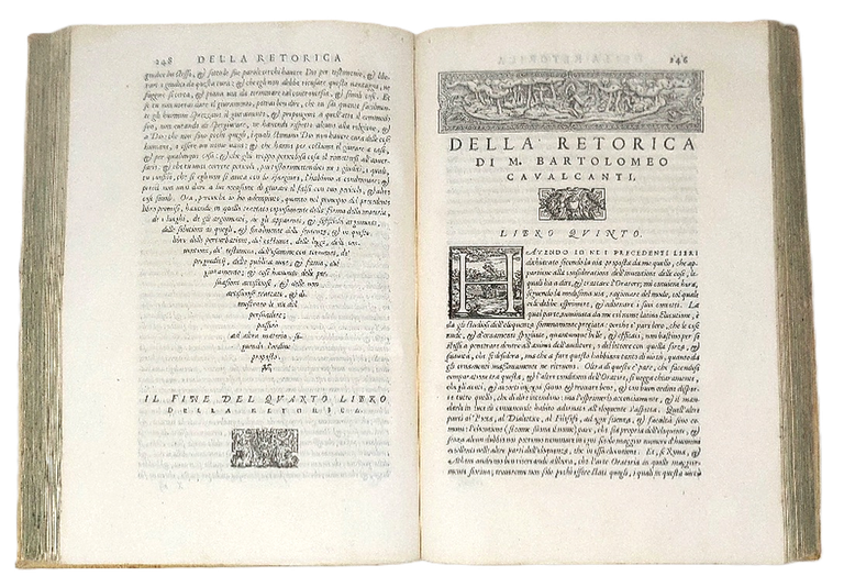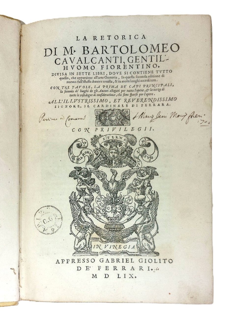 >In-folio, pp. (32), 563, legatura '700esca in pergamena rigida, titolo ms. su dorso a nervi. Grande marca tipografica sul frontespizio, graziose testatine, iniziali e fregi xilogr., testo in nitidissimo cararette corsivo. Dedica dell'a. al ''Cardinale di Ferrara'' (Ippolito II d'Este). Seconda edizione di quest'opera, ''primo trattato di Rettorica che si avesse in lingua italiana''. L'immediato successo e ''lo spaccio sì pronto'' della prima ediizone costrinsero il Giolito a ristampare l'opera ''che uscì nell'anno stesso..., la quale, per essere corretta ed in più luoghi migliorata dall'autore stesso, è degna d'essere preferita'' (Bongi II, p. 72-76). Il Cavalcanti (Firenze 1503 - Padova 1562) fu letterato ed uomo politico, al servizio di svariati eminenti personaggi dell'epoca. Ottimo esemplare di opera impressa con notevole cura (timbro ed ex-libris ms. sul tit., lievi ingialliture agli ultimi 8 ff., piccoli forellini di tarlo al margine interno di alcuni fogli). BMC 162. Gamba 1307 (terza ediz.).