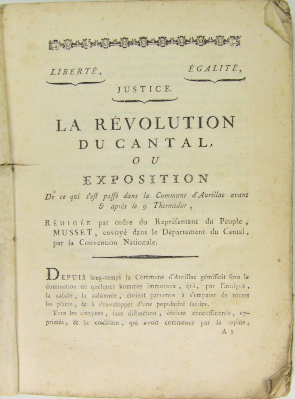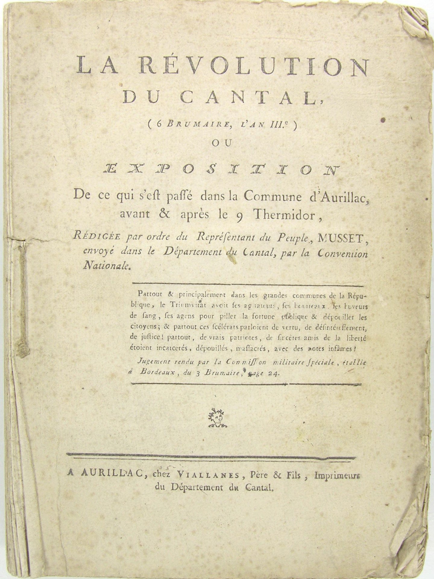 La révolution du Cantal (6 Brumaire, l'an III) ou Exposition de ce qui s'est passé dans la commune d'Aurillac avant & après le 9 Thermidor | Rare and modern books | Musset