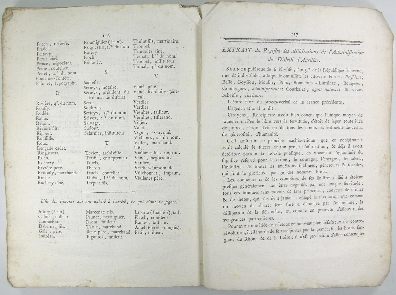 A Aurillac chez Viallanes père & fils, brochure grand in/8 broché, 124 pages avec la table. Rédigée par ordre du représentant du peuple, Musset, envoyé dans le département du Cantal par la Convention Nationale.