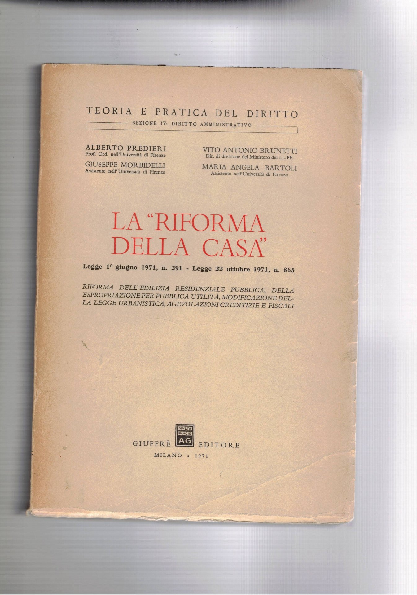La riforma della casa. Riforma dell'edilizia residenziale pubblica , della espropriazione per pubblica utilità, modificazioni della legge urbanistica… Legge 1 giu. 1971 n° 291 - legge 22 ott. 1971 n° 865.