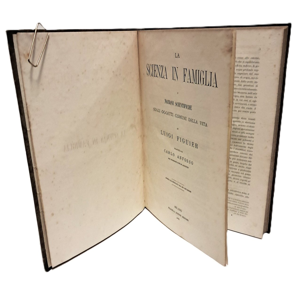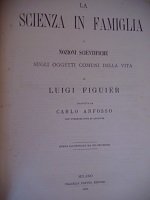 Versione tradotta da Carlo Anfosso con numerose note ed aggiunte Opera divulgativa destinata a diffondere la cultura scientifica a livello popolare. Il primo capitolo si occupa dell'Aria atmosferica, della sua composizione, dei suoi effetti sull'uomo e sugli animali; il secondo verte sugli alimenti e viene studiato il pane e le sue numerose varietà, il latte, il burro, il formaggio, le uova. Poi vengono considerate le carni, che comprendono le bestie macellate, la selvaggina e il pollame. Si passa poi ai pesci di mare e d'acqua dolce che servono da alimento. Vengono poi i legumi e i frutti alimentari. Il terzo capitolo è dedicato alle bevande, il quarto i condimenti, sostanze che non sono precisamente dei commestibili ma che entrano nell'alimentazione come base dei condimenti di cucina. Il capitolo quinto abbraccia lo studio delle differenti sostanze che si impiegano per la toelette, sapone, pomate, pettine, acque d'odore e profumi. Il sesto capitolo studia i tessili. Con 325 incisioni nel testo. Cartonato. Ottime condizioni generali, qualche fioritura. Pp. 343.