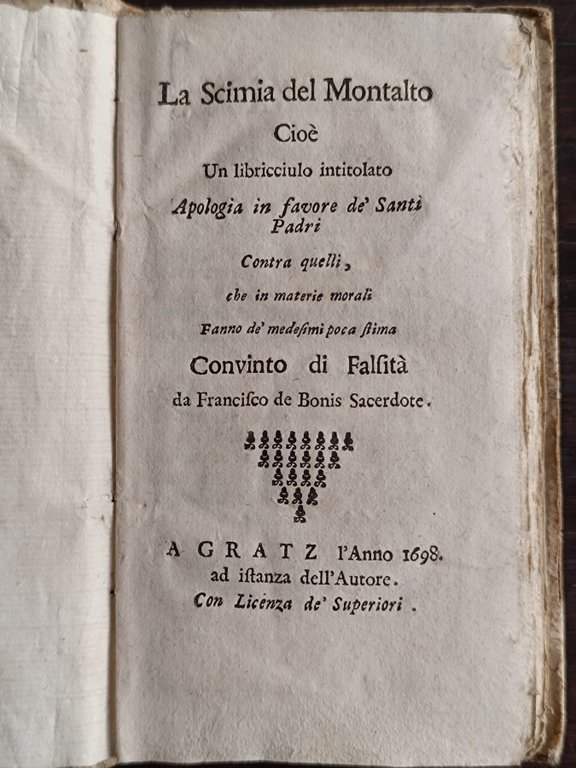 La Scimia del Montalto cioè un libricciulo intitolato Apologia in favore de' Santi Padri contra quelli, che in materie morali fanno de' medesimi poca stima convinto di falsità da Francisco de Bonis sacerdote.