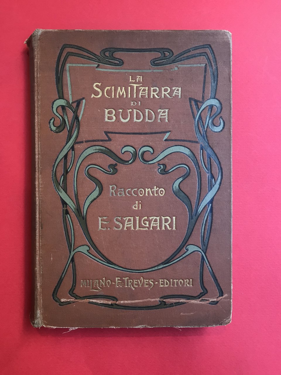 In-8°, pp. 252, (8) di catalogo della Treves, legatura in tela editoriale con elegante fregio liberty impresso in nero e colorato in verde che incornicia il titolo impresso in oro. Usure e piccoli strappetti alle cuffie e agli angoli. tracce di colla alle carte di guardia. strappo senza mancanze al lato superiore della pagina 91