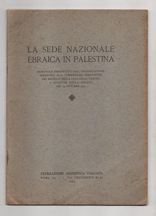 La Sede nazionale ebraica in Palestina. Memoriale presentato dall’organizzazione sionistica alla Commissione permanente dei mandati della Lega delle Nazioni a Ginevra nella seduta del 24 ottobre 1924