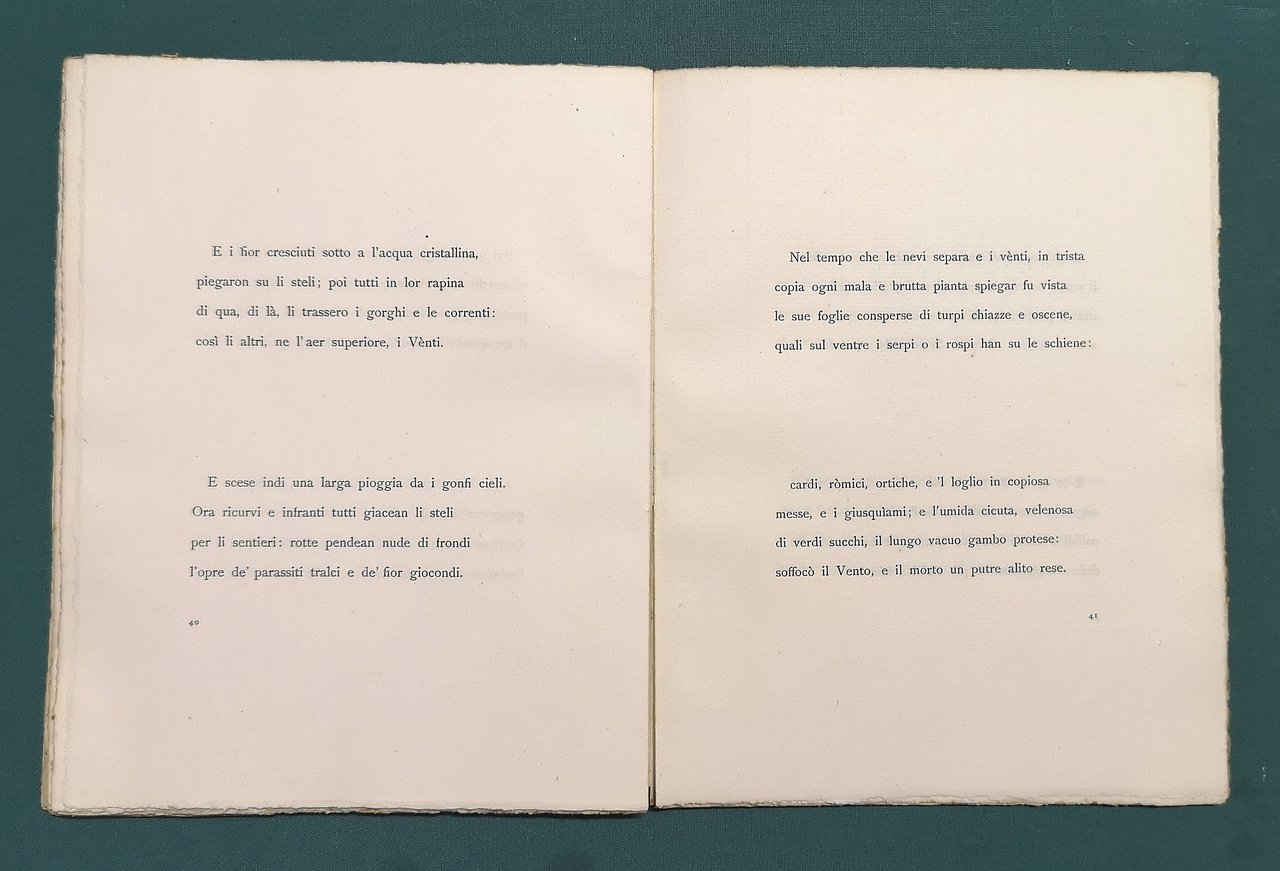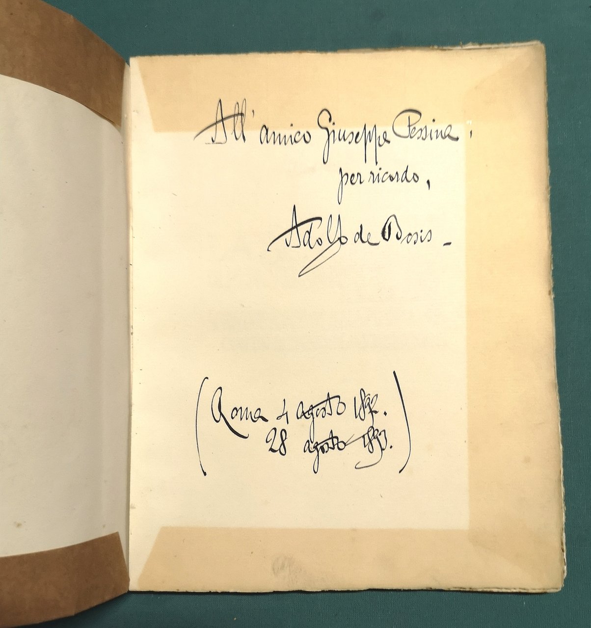 >in-8, pp. 55, (3), testatine in sanguigna, disegno in sanguigna di Ricci in apertura della II parte; broch. edit. con sovracoperta in pergamena vegetale, titolo al piatto ant. entro cornice floreale. Prima traduzione italiana di De Bosis, in elegante edizione impressa su carta forte. Non comune. Ottimo esemplare, freschissimo, marginoso, in barbe, con dedica autografa dell'A. all'occhietto: "All'amico Giuseppe Pessina, per ricordo, Adolfo De Bosis (Roma 4 agosto 1892 28 agosto 1893)"; (ingialliture al foglio di occhietto e alla controsguardia post. per il contatto con la sovracoperta).