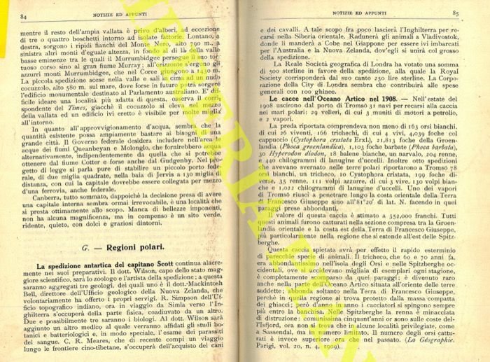 La spedizione antartica del capitano Scott. Le cacce nell'Oceano Artico nel 1908. Il duca d'Orleans rinuncia alle spedizioni artiche. Il giudizio sui documenti dell'esploratore Cook.