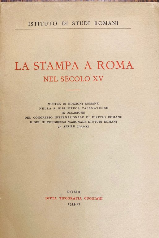 >in-8, pp. 29, (1), broch edit. Mostra di Edizioni romane nella R. Biblioteca Casanatense in occasione del congresso internazionale di diritto romano e del III congresso nazionale di studi romani 25 aprile 1933-XI.