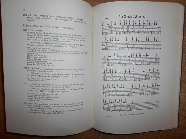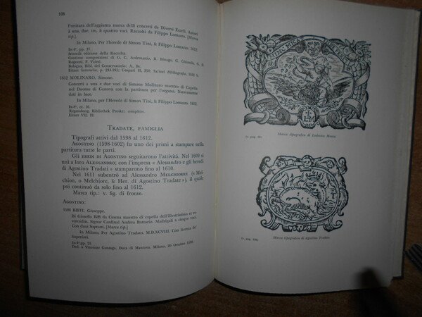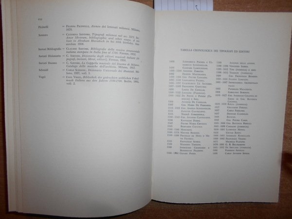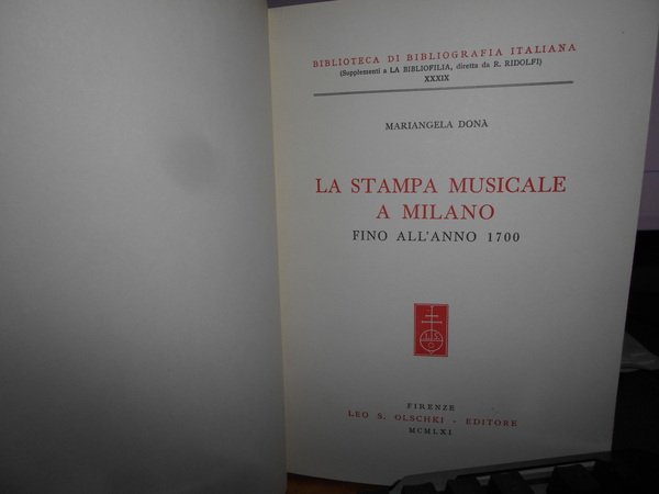 Mariangela Donà. Firenze, Leo S. Olschki, 1961. La Stampa Musicale a Milano fino all' anno 1700. In-8°, tela con titolo in oro entro tassello al dorso, copertine originali conservate. viii, (1), 167, (2) pp. con alcune tavole fuori testo. Perfetto esemplare in legatura recente con le copertine originali conservate. Uff. E - V - 1