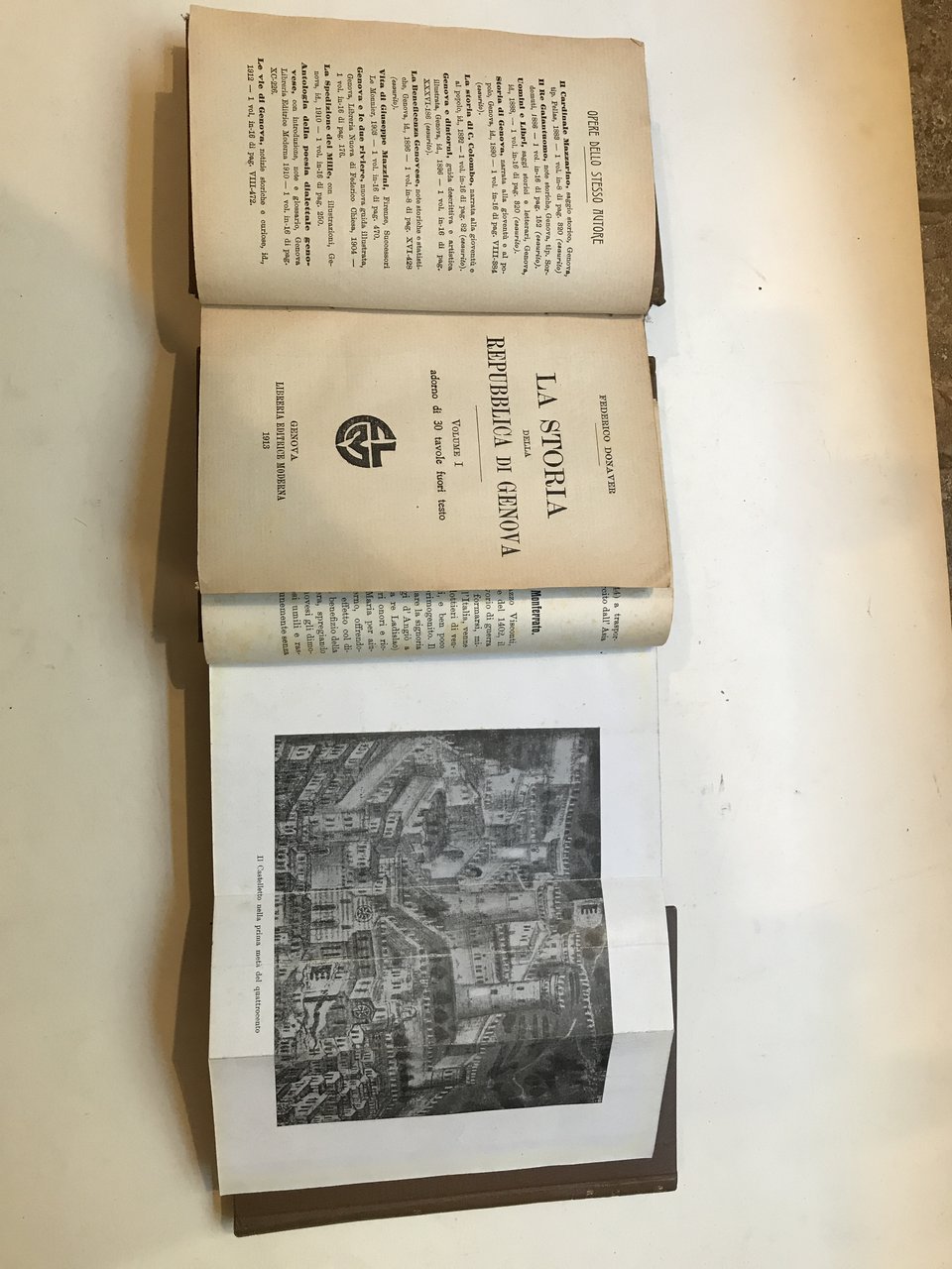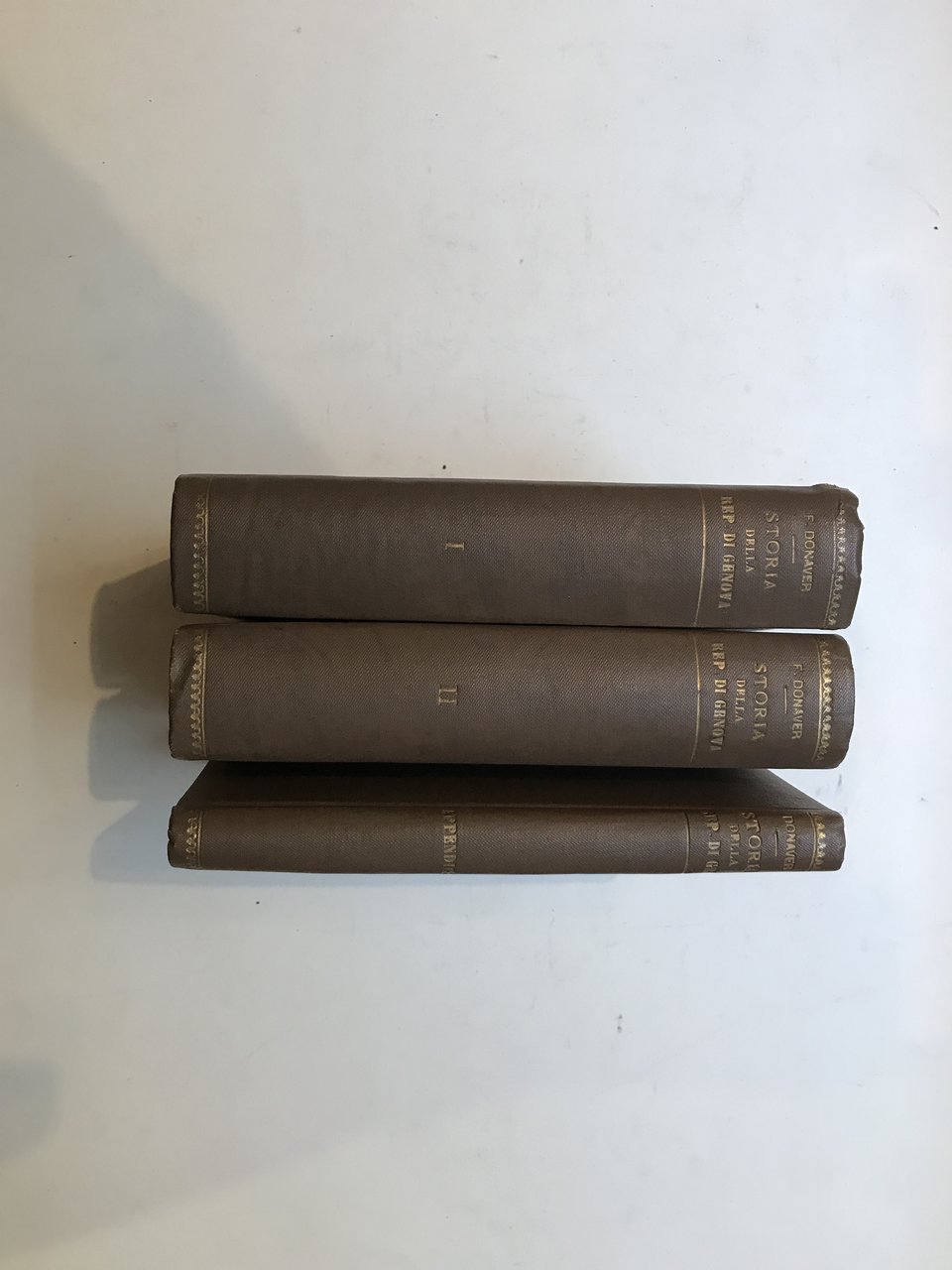 3 voll. in-8°, pp. XVI,389; VII, 415, (4); 208, 60 illustrazioni f.t. e 2 grandi carte più volte rip. legature in tutta tela dell'epoca, titolo e fregi in oro al dorso. Le illustrazioni raffigurano: il Dominio dei Genovesi dal XII al XV secolo, la Stato della Repubblica nel 1797, e importanti documenti storici. Il terzo volume contiene l'appendice con Note illustrative delle 60 tavole, serie dei Consoli. Podestà, Capitani del Popolo e Dogi a vita e Biennali della Repubblica di Genova dal 1099 al 1797. Buon esemplare.