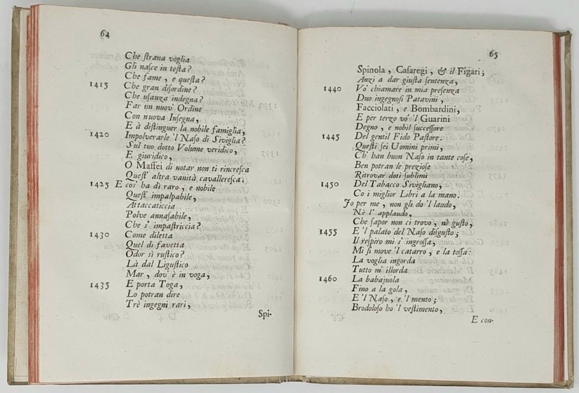 >in-4 (215 x 160 mm), pp. (16), 240 (carattere corsivo per le pagine di versi del poema, carattere tondo per le annotazioni); vignetta xilograf. raffigurante la personificazione del fiume Eridano sul frontespizio. Legatura coeva in piena pergamena rigida con titolo in oro su tassello (posteriore) al dorso, tagli rossi. Seconda edizione di questa bizzarra e curiosa opera che si dedica in due parti alla "pazzia de gl'huomini, & nella seconda a quella delle donne. Da che si viene in cognitione della pazzia de' mondani, con molta dilettazione, & utile de' leggenti". Divertente quanto dotta operetta satirica, assai rara. Perfetto esemplare. Niccoli 235; Gamba 2143 (nota).