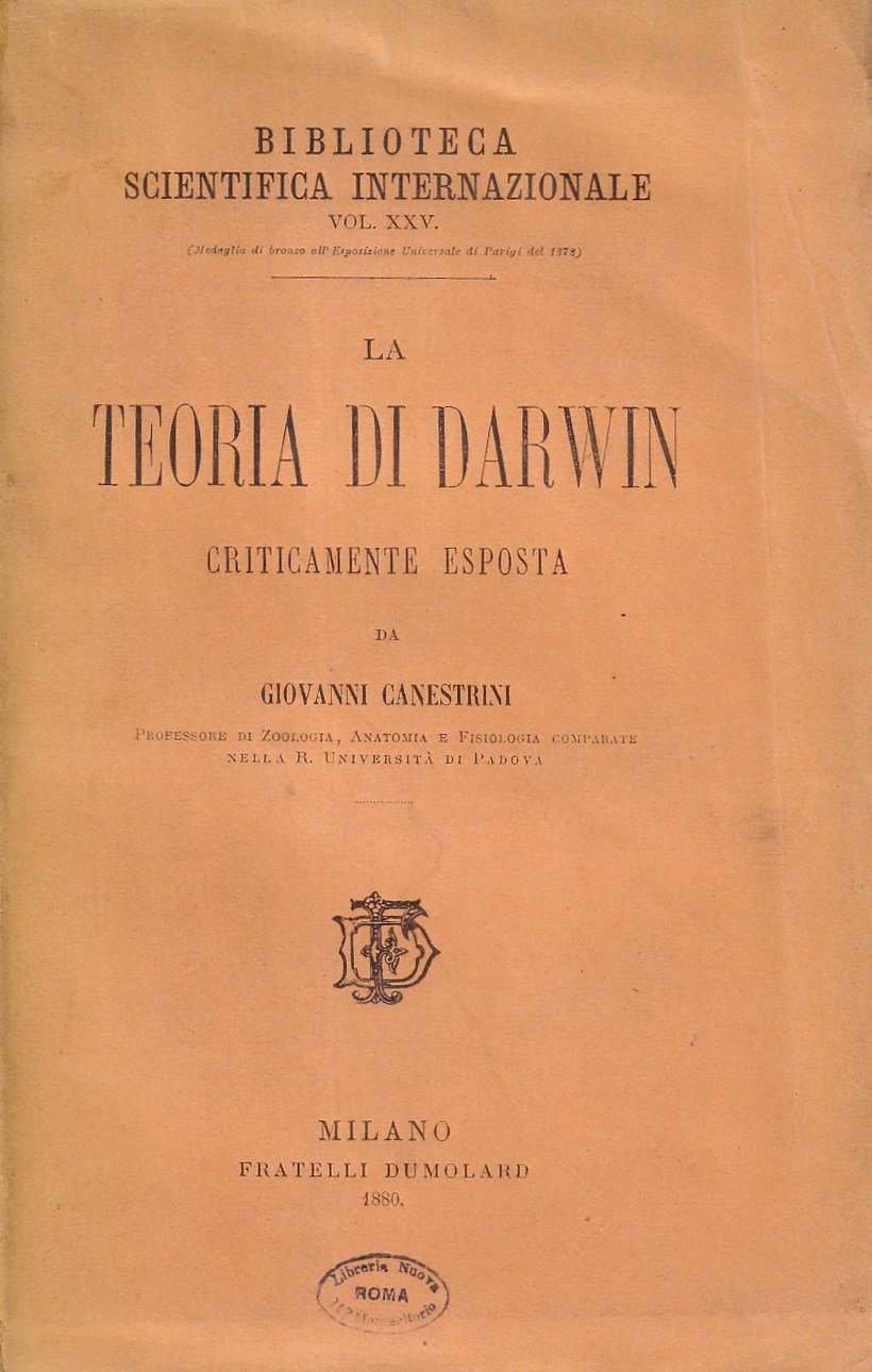 RARO. Prima edizione. "Biblioteca scientifica internazionale" Vol. XXV - Brossura editoriale di x-350 pagine in gran parte ancora intonse. Edizione originale di questa importante opera del celebre biologo, naturalista e aracnologo italiano, Giovanni Canestrini (Revò di Trento, 26 dicembre 1835 Padova, 14 febbraio 1900) che fu tra i massimi divulgatori del pensiero darwiniano in Italia. Nella presente opera l'autore condensa i principi del pensiero darwiniano in modo da renderli comprensibili al grande pubblico, insistendo a più riprese sull'origine animale dell'uomo. L'opera contribuì in modo decisivo alla divulgazione delle teorie evoluzionistiche ancor di più che la traduzione stessa dell'Origine delle specie di Darwin -- Dorso incollato, piccoli timbri di libreria al piatto e al frontespizio, una firma all'occhietto, peraltro esemplare in più che buono stato di conservazione. SPEDIZIONE IN 24 ORE DALLA CONFERMA DELL'ORDINE.