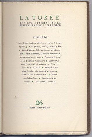 La Torre. Revista General de la Universidad de Puerto Rico. Director: Jaime Benítez. Año VII, Número 26, Abril-Junio 1959.[ Juan Ramón Jiménez: El Romance, rio de la Lengua Española; Angel Ferrant: En los yacimientos de mi escultura; Francisco Ayala: Sobre el realismo en literatura; Gustavo Correa: El arquetipo de Orbajosa en "Doña Perfecta" de Pérez Galdós, y otros trabajos.]