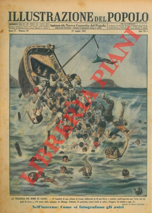 La tragedia dei bimbi di Loano. 81 bambini di una colonia di Loano, imbarcati su di una barca a motore, naufragavano per l'urto con un palo di ferro a 170 metri dalla spiaggia di Albenga. Soltanto 35 poterono essere tratti in salvo.