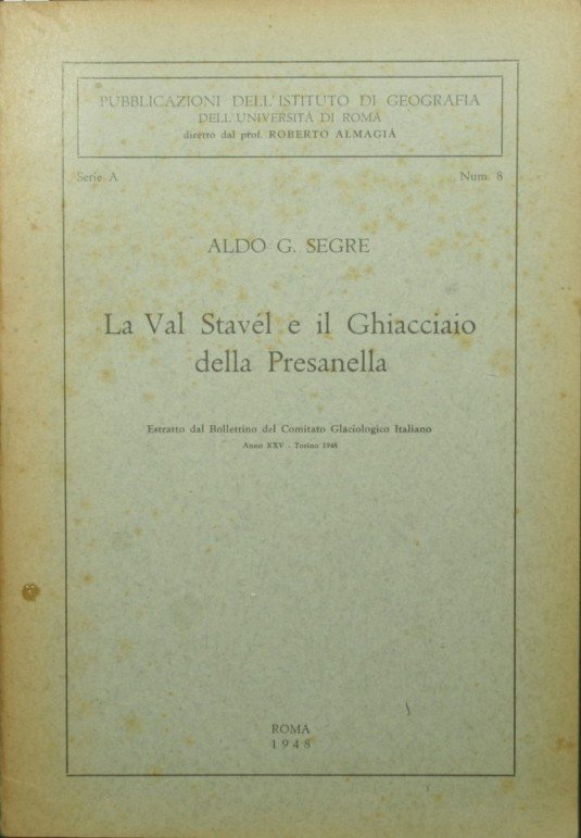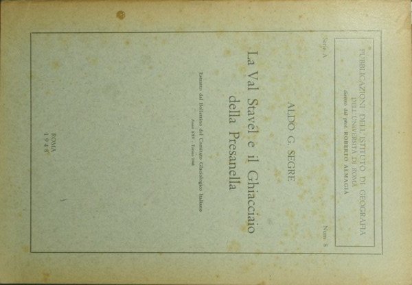 Estratto dal Bollettino del Comitato Glaciologico Italiano. Anno XXV - Torino 1948 - Collana Pubblicazioni dell'Istituto di Geografia dell'Università di Roma diretto dal prof. Roberto Almagià. Serie A, n. 8 - in 8° - pp.27 - Brossura editoriale - Illustrazioni in b/n nel testo e fuori testo, una carta in b/n ripiegata fuori testo