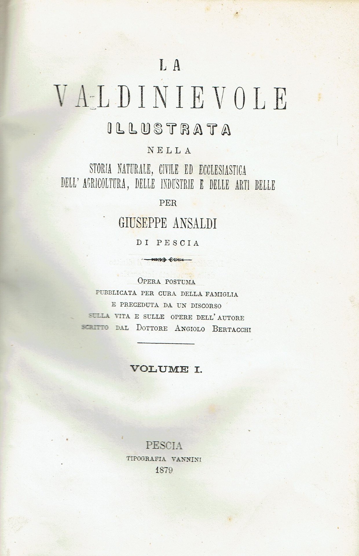 2 volumi in uno, edizione originale del 1879 rilegata in mezza tela con titoli in oro al dorso. Opera postuma pubblicata per cura della famiglia e preceduta da un discorso sulla vita e sulle opere dell'Autore scritto dal dottore Angelo Bertacchi. copertina rigida Ottimo (Fine) alcune fioriture sui tagli, parte superiore di p. 369 (indice del 2 v. tagliato), piccola mancanza a p. 371, interno come nuovo.
