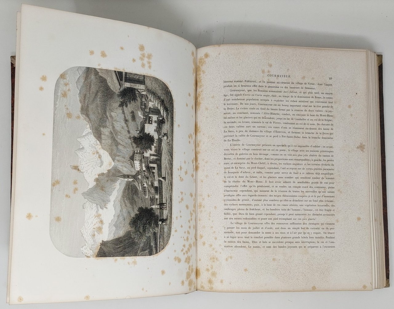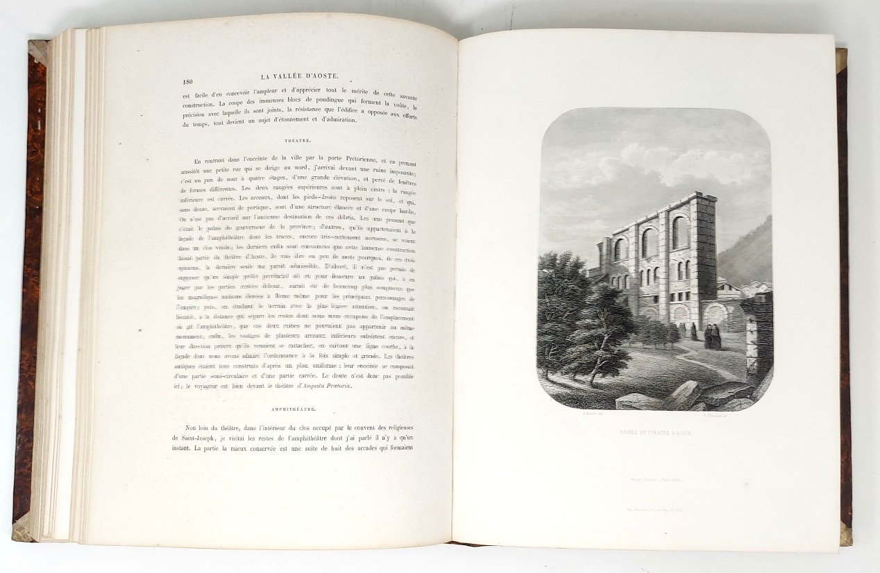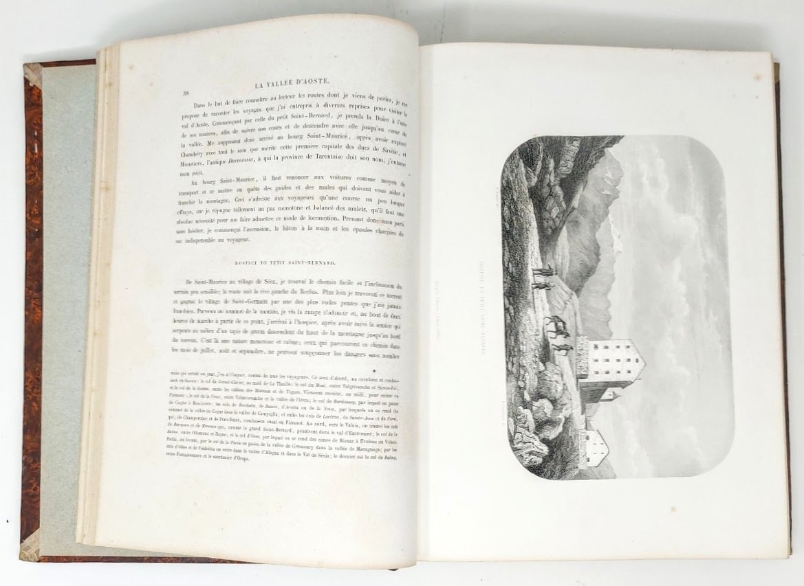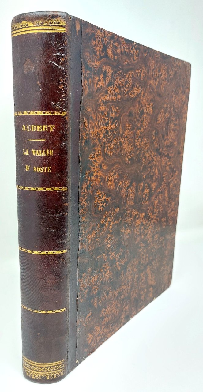 >in-4 gr. (330x260 mm), pp.(8), 280, legatura coeva in m. pelle, titolo e fregi in oro al dorso. Prima edizione dell'opera più pregiata sulla Valle d'Aosta, assai ricercata, ricca di illustrazioni disegnate da Aubert medesimo e incise da Chavanne: una carta topografica, 33 vedute f.t. di paesi e castelli finemente incise in acciaio, 4 tavole di stemmi e 2 di mosaici della cattedrale in cromolitografia, 97 vedute nel testo in silografia. Esemplare magnifico, a pieni margini (comuni fioriture della carta su alcuni fogli e tavole). Perret 0163: «Un magnifique ouvrage sur le Val d'Aoste. Devenue rare, l'édition originale de cet ouvrage réputé est très recherchée». Meckly 006: «...many charming illustrations of the historical buildings of Chamonix and Courmayeur as well as the valley and Mont Blanc». Durio n. 63: «A pag. 129-131 Mont-Rose et Gressoney S. Jean». Monte Bianco '800 p. 128.