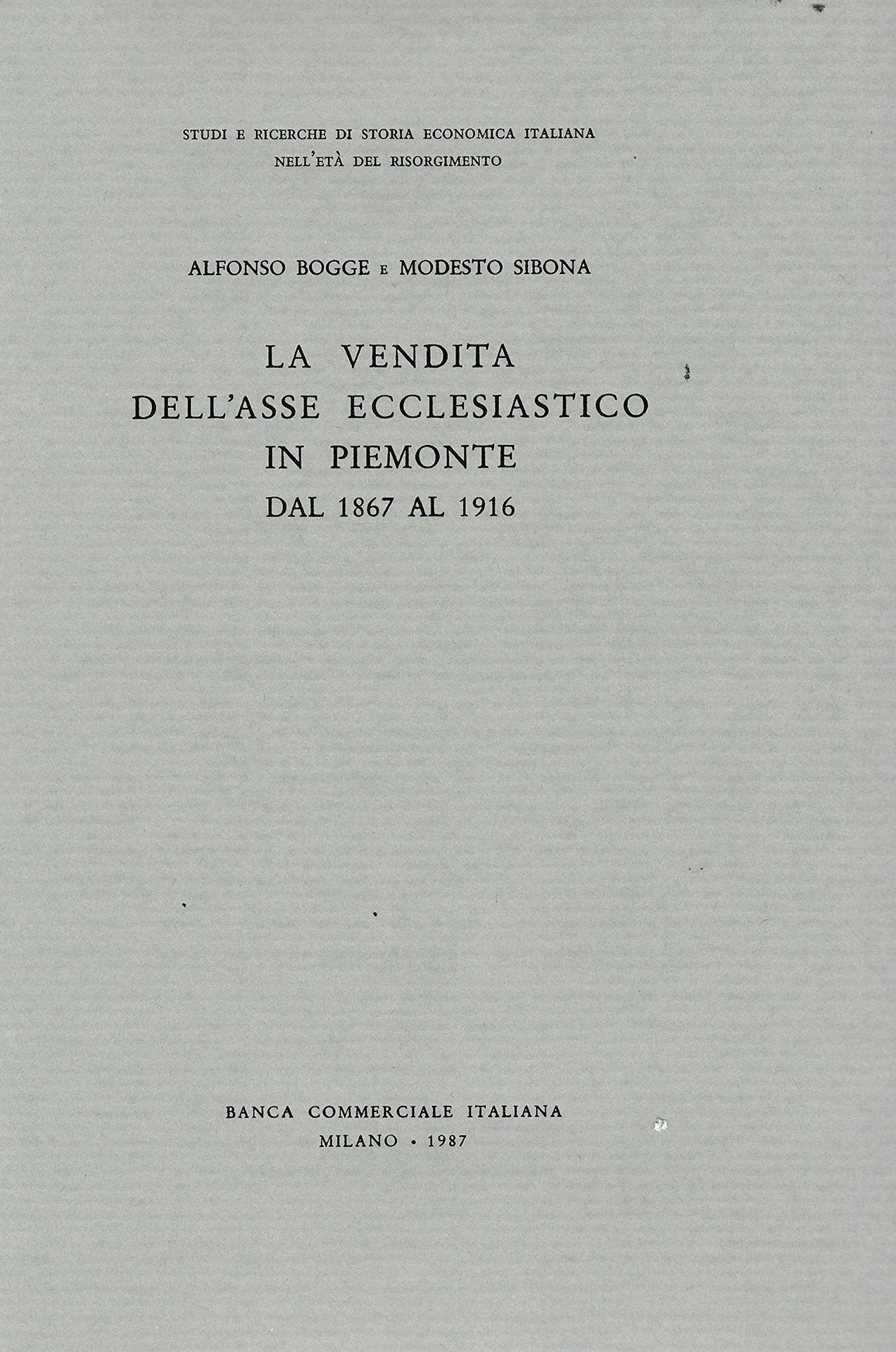 In appendice: Lotti dell'asse ecclesiastico venduti in Piemonte (1867-1916). Milano, 1987; pp. 1525, 87 tavv. num. n.t., cm 16x25. (Studi e ricerche di Storia economica italiana nell'età del Risorgimento).