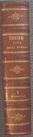 VOL I - I Mammiferi - II edizione italiana tradotta sulla terza ed originale-Traduzione di Michele Lessona - in 8° - pp.LXXI + 741 - Mezza pelle con titolo e fregi in oro al dorso - 139 figure nel testo e 22 tavole separate