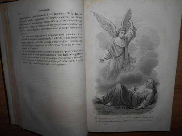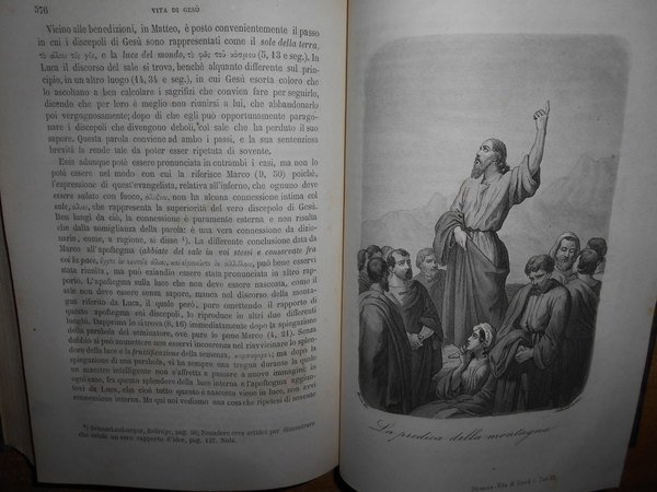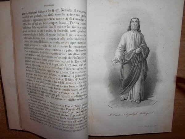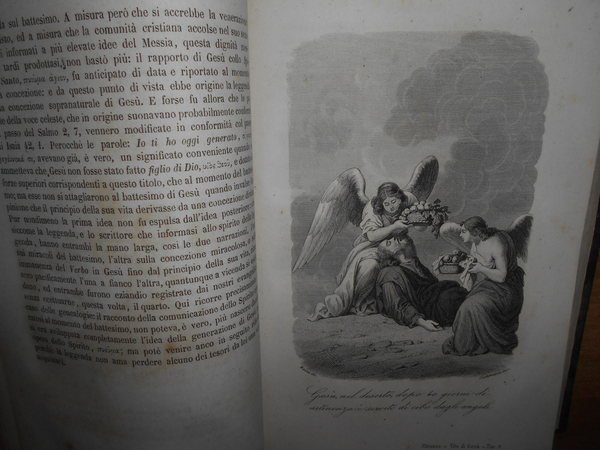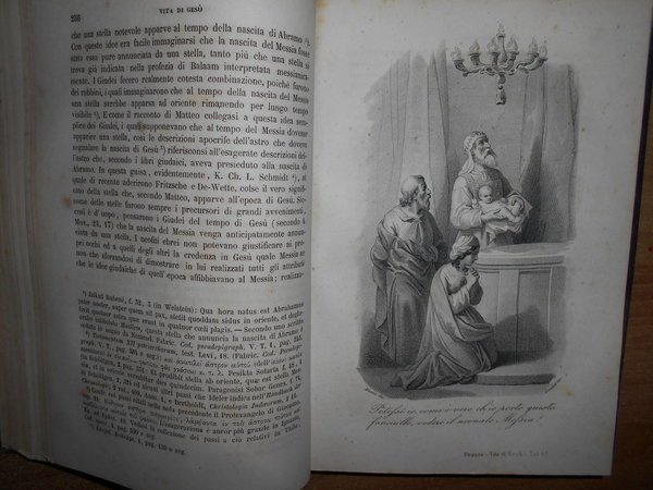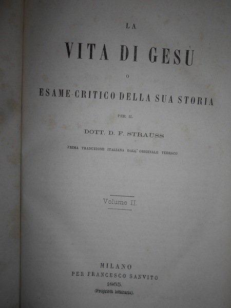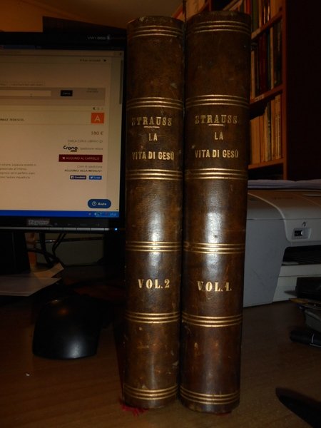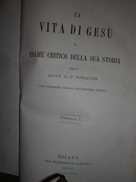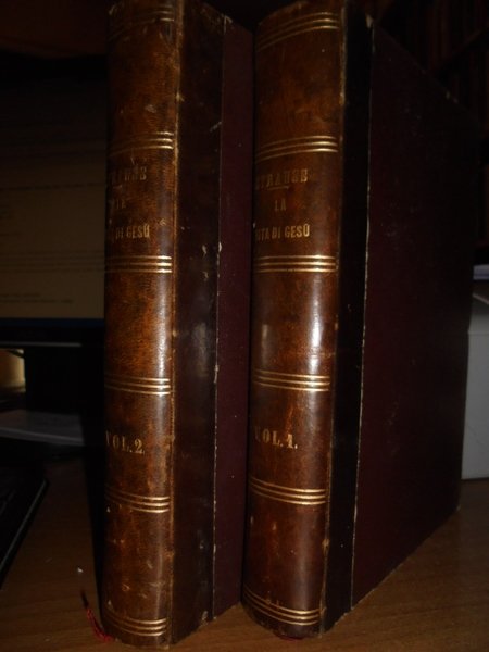 Dott. D.F. Strauss. Milano, per Francesco Sanvito, 1863. La Vita di Gesù o esame critico della sua storia. Prima traduzione italiana dall' originale tedesco. 2 volumi in-8°, m.pelle coeva con fregi e titoli in oro ai dorsi. 671 pp.; 640 pp. con complessive 27 tavole fuori testo. Esemplare completo di tutte la tavole. Ottimo esemplare con qualche pagina arrossata. Opera rara e, come è noto, assai controversa per come l'autore inquadra la figura di Gesù. Neg. sotto esot.