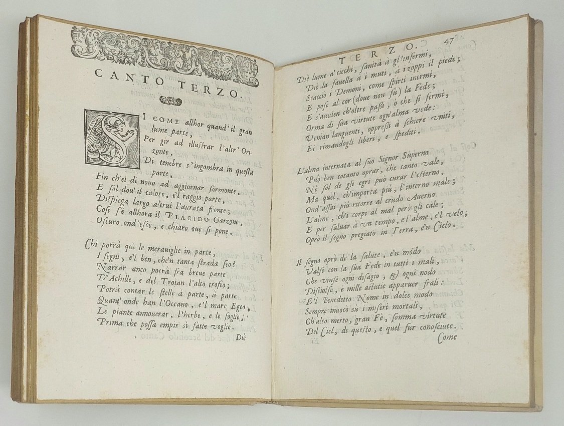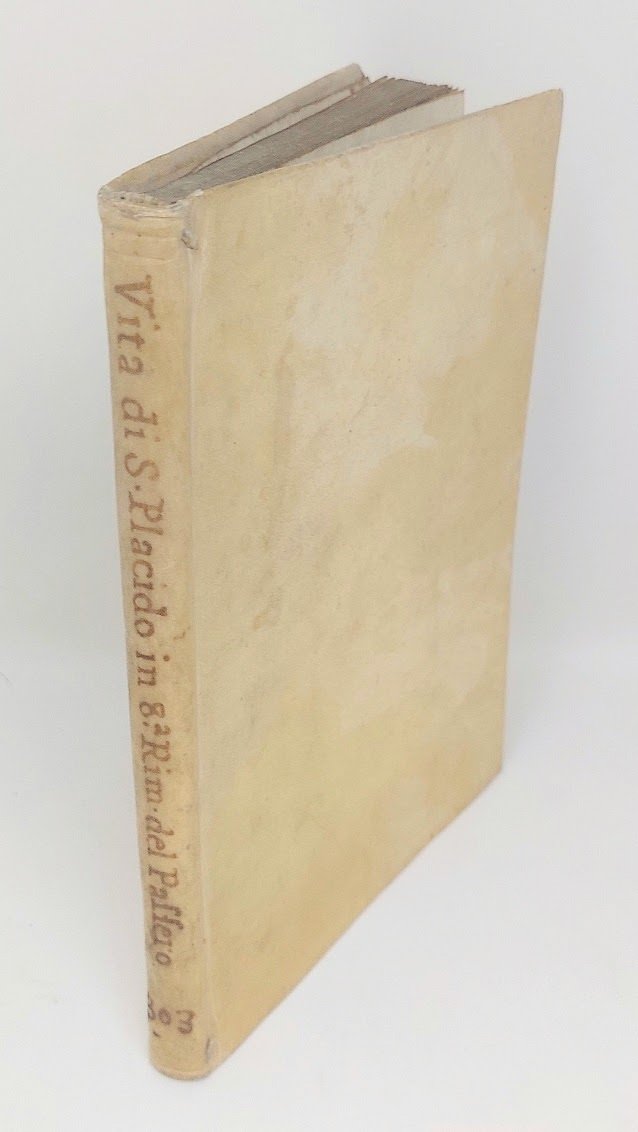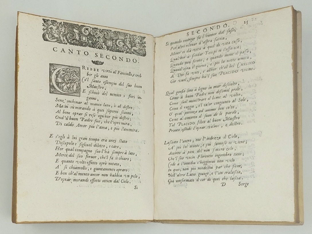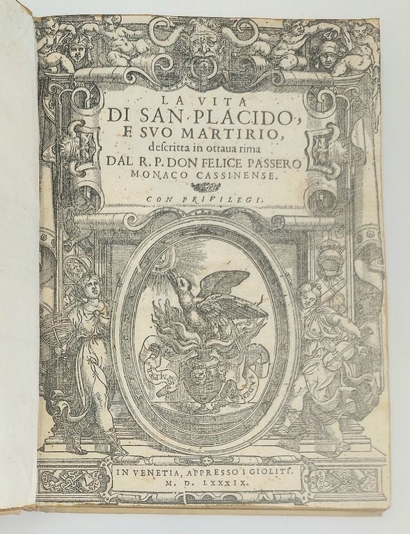 >in-4, pp. (20), 100, leg. coeva p. pergamena rigida, titolo manoscritto al dorso. Titolo in elaborata bordura figurata con al centro l'impresa tipogr., testatine e belle iniziali istoriate. Dedica dell'a. a Fulgenzio de' Ferrari, abate di S. Sisto in Piacenza. Edizione originale di questo poemetto di cinque canti in ottava rima di Felice Passero (ca. 1570-1626), monaco benedettino, composto in occasione del rinvenimento in Messina nel 1588 delle ossa di San Placido, dei suoi fratelli e di 30 monaci benedettini martirizzati in quel luogo dal saraceno Mamuca, capitano di Adala Re di Spagna, ai tempi di Teodorico e Giustiniano. Per tale ritrovamento furono organizzate grandi feste nella città siciliana. Bell'esempl. (nonostante il margine super. rifilato). Bongi II, p. 437. Narbone I, p. 402. BMC 492.