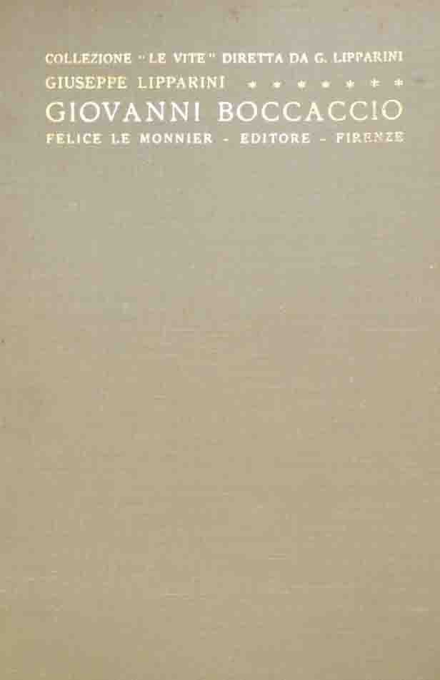 La vita e l’opera di Giovanni Boccaccio, a cura di Giuseppe Lipparini, Felice Le Monnier Editore, Firenze 1927, pp. 168, 2 c. di tavv. f.t. ill. b.n., cm 21, legatura in tutta tela ed. con titoli in oro al dorso e al piatto. Collana Le vite diretta da G. Lipparini. Sigla d’appartenenza alla prima carta. Leggere tracce d’uso, qualche fioritura, carta lievemente brunita, per il resto ben conservato.