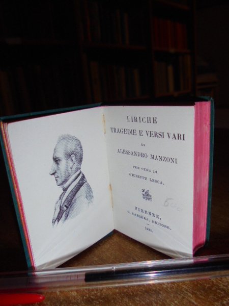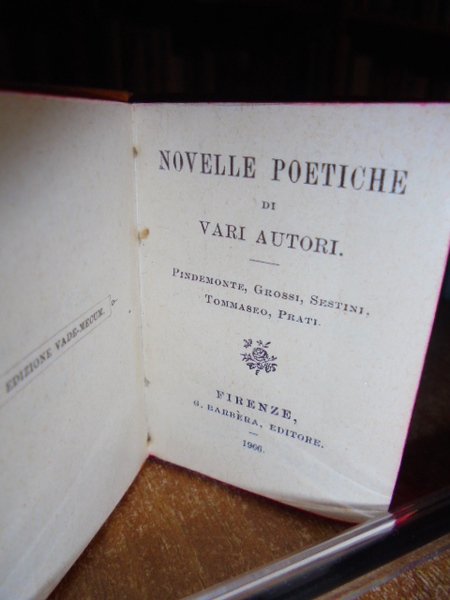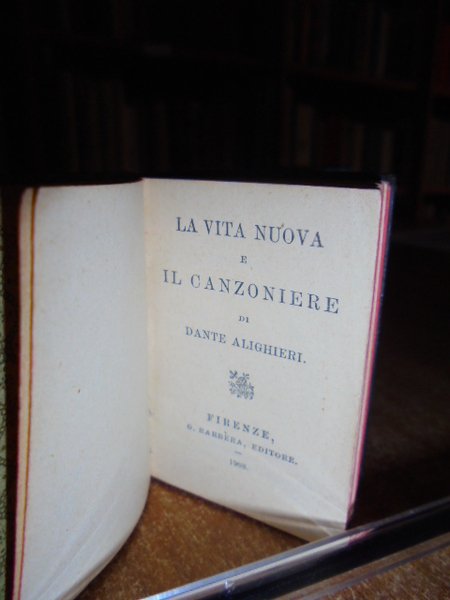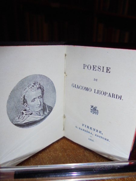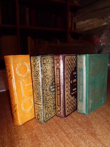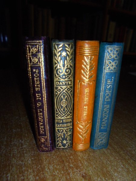 4 VOLUMI. IN - 64°, (CM. 6, 4 X 4, 5): La vita nuova e il Canzoniere. Dante Alighieri. Firenze, Barbèra, 1908. viii, 208 pp. Novelle Poetiche di vari Autori. Firenze Barbèra, 1906. 372 pp. Poesie. Giacomo Leopardi. Firenze, Barbèra,1916. 354, (1) pp. con ritratto dell' Autore. Alessandro Manzoni. Liriche tragedie e versi vari. Firenze, Barbèra, 1923. 531, (7) pp. con ritratto dell' Autore in antiporta. PIENA PELLE ORIGINALE ROSSA, BRUNA O VERDE ARTISTICAMENTE DECORATA IN ORO NEI PIANI E NEL DORSO CON VARI FREGI. STAMPATA SU CARTA INDIA. Tagli rossi. << EDIZIONI VADEMECUM >>. COLLANA DI CLASSICI ITALIANI PUBBLICATA DA G. BARBÈRA A FIRENZE. Sono i più piccoli libri leggibili ad occhio nudo, in carattere mobile corpo 4. << PRINTED IN TINY BUT VERY CLEAR TYPE, THAT COLLECTION OF EMINENT LITERARY WORKS HAS MEANT FOR THOSE ADDICTED TO IALIAN LITERATURE, THAT THEY BELOVED BOOKS COULD IN THE FULL SENSE OF THE WORLD GO WITH THEM, AS THE TITLE INDICATED. THE TYPE USED WAS MADE BY THE FOUNDRY OF FLIMISCH IN FRANKFURT AM MAIN, AND IS A 4 1 / 2 - POINT DIAMANT ANTIQUA. IN SPITE OF ALL THE PROTEST AGAINST THEIR TINITESS AND THE DAMAGE THEY CAN DO THE EYE - SIGHT, MINIATURE BOOKS AND MICROSCOPIC TYPE ARE AND WILL REMAIN GREAT FAVOURITES >> (BONDY, PP. 99 - 100). CM. 6, 4 X 4, 5. Neg. Mob. 7 entro busta