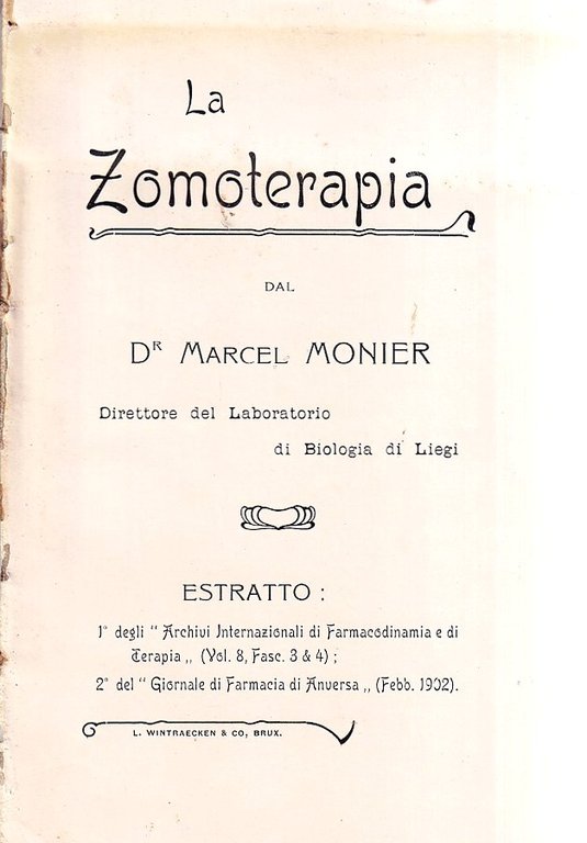 Senza data, primi del Novecento. Estratto: 1° degli "Archivi internazionali di Farmacodinamia e di Terapia" (Vol. 8, fasc. 3 & 4); 2° del "Giornale di Farmacia di Anversa" (febbraio 1902) - Brossura originale di 31 pagine. Esemplare in ottime condizioni complessive; opuscolo non comune.