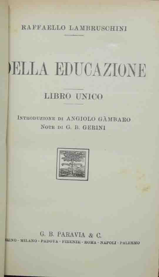 Raffaello Lambruschini, Della educazione. Libro unico, introduzione di Angiolo Gàmbaro, note di G. B. Gerini, G. B . Paravia e C., Torino 1939, nona rist. della nuova ed., pp. 306, cm 20, legatura in mezza tela muta. Alla prima pagina, firma d’appartenenza, luogo e data. Minime fioriture, sporadiche sottolineature a pastello su qualche carta, per il resto molto ben conservato.