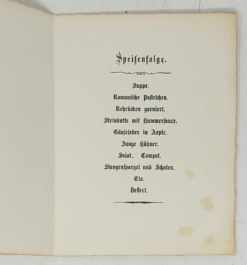 >Menù ripiegato in 2 (182x140 mm), cartoncino impresso e figurato in nero. In copertina una veduta del castello di Nieder-Langheinersdorf affiancato da mazzetto di fiori e due scudi araldici, tra cui quello della famiglia von Kottwitz, all'interno menù (Speisenfolge) di 10 portate, probabilmente per un banchetto di nozze. Ben conservato, con invito manoscritto "From Gleim".