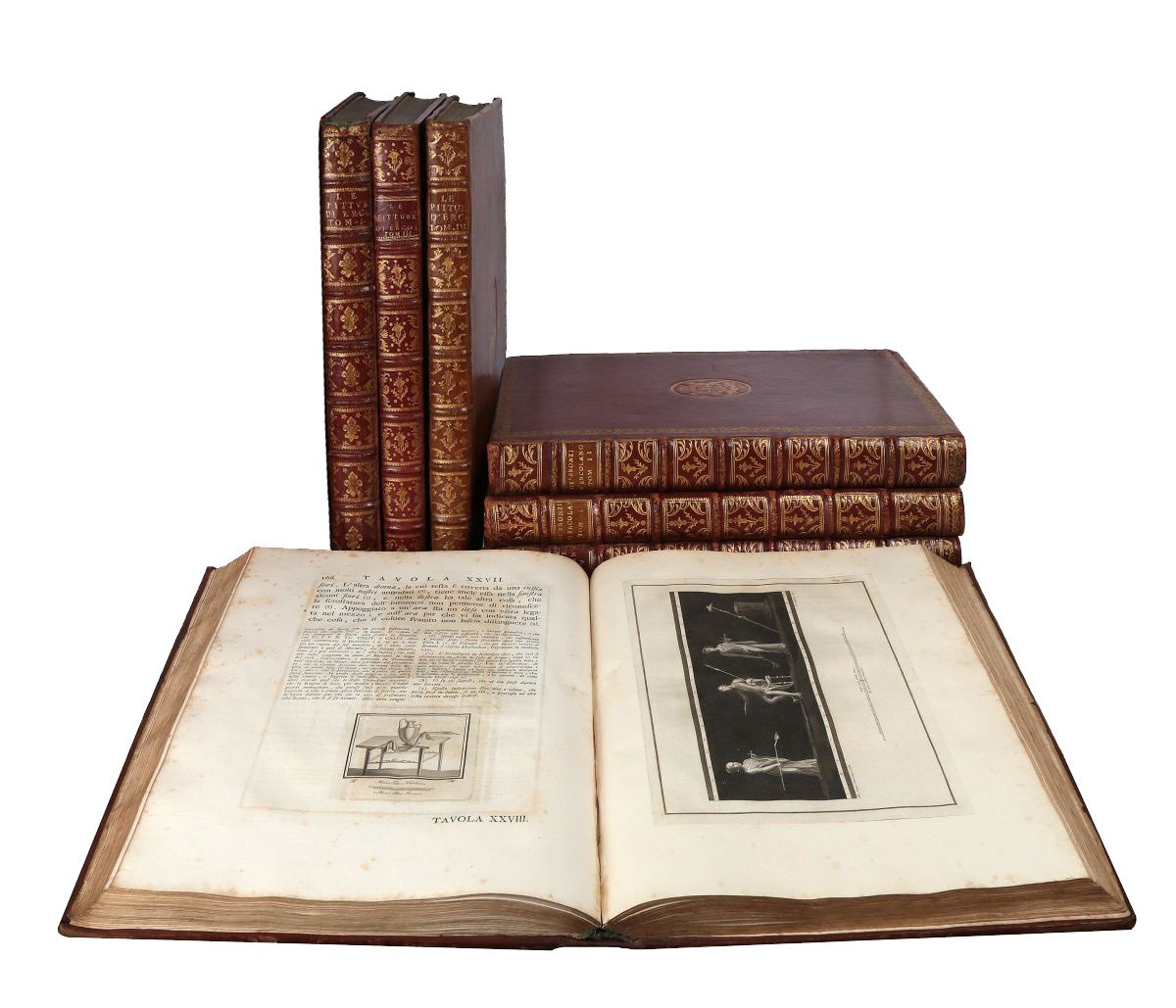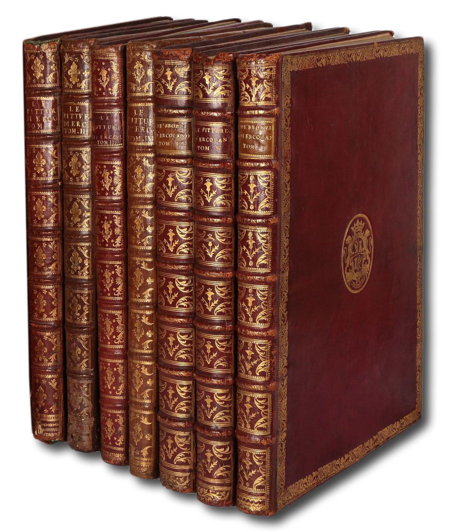 >7 volumi in-folio grande (cm 48x36), eccezionali legature dell'epoca alle grandi armi araldiche dei Turinetti di Priero in ovali al centro dei piatti: cinque volumi sono in pieno marocchino rosso, mentre due in vitello biondo. Tutti sono arricchiti da una raffinata larga bordura a fiori e frutti in oro ai piatti, mentre i dorsi a 8 scomparti riportano il titolo e decorazioni floreali ai piccoli ferri, con. Lo stemma coronato è retto da due leoni controrampanti, con il motto "non degenero". MALAGUZZI n.7 lo identifica con certezza con le armi di Ercole III Turinetti di Priero (1717-81). (restauri alle cuffie, qualche lieve spellatura). Di gran lunga la più importante tra le biblioteche piemontesi del Settecento fu quella dei Turinetti di Priero "nobile famiglia chierese le cui fortune, legate alla finanza, raggiunsero il loro apogeo nel XVIII secolo per ridursi progressivamente sino alle confische legate ai moti del 1821. Di loro biblioteche ho trovato notizie di varia natura per il periodo che va dal 1781 al 1806… Nello stato sabaudo non fu così comune come in Francia l'uso con legature con l'arma del proprietario …" (F. MALAGUZZI, Biblioteche storiche disperse, p. 37-52; e Alla mezza aquila bicipite d'argento, interamente dedicato alla biblioteca Turinetti). Questi sette poderosi volumi sono adorni di 6 ritratti di Carlo III, una carta del Golfo di Napoli a doppia pag., oltre 500 tavole, circa 500 iniziali incise e 700 testate e finalini.