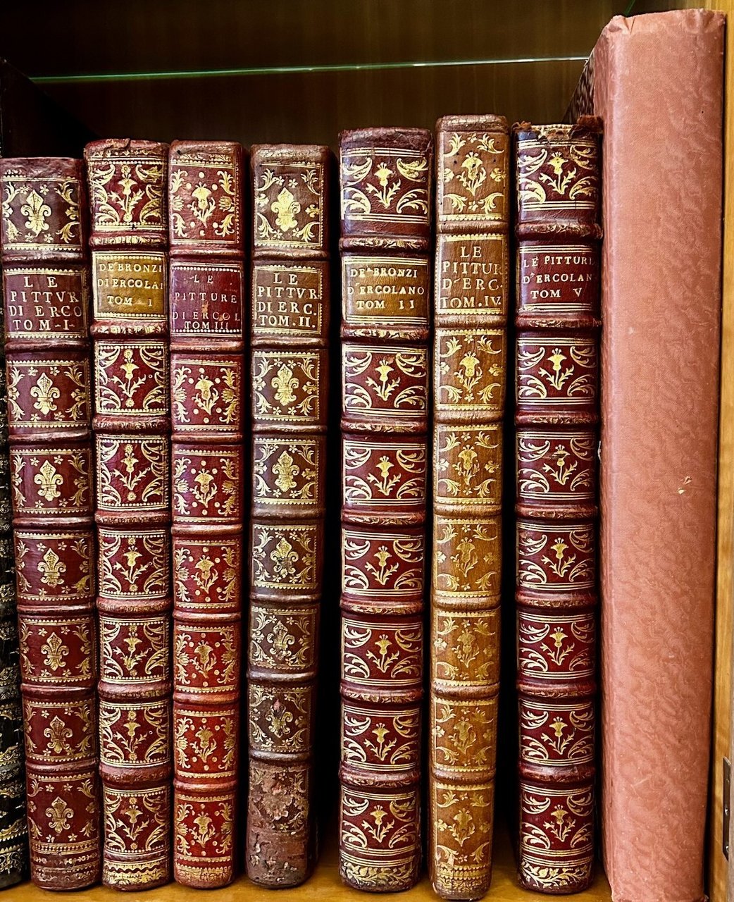 I) 1757: occhietto, frontespizio con vignett9, 50 tavv. incise in rame nel testo, (7) di indici, (1) bianca.II) 1760: occhietto, frontespizio con vignetta a, (l'antiporta con ritratto di Carlo III in ovale pp. (2), 1 tavola f.t. a doppia pagina del Golfo di Napoli, pp. 27, antiporta con ritratto di Carlo III come al primo vol., pp. (4) di dedicatoria al medesimo Carlo III di Borbone, (5) di prefazione, (1), 339 comprensive di 60 tavole incise in rame, (10) di indici.III) 1762:occhietto, frontespizio e antiporta come al primo e al secondo volume, pp. XVII di dedicatoria e prefazione, 329 di cui 60 tavole, (12) di indice.IV) 1765: occhietto, frontespizio e antiporta come ai primi 3 voll., pp. X di dedica e prefazione, 368 di cui 79 tavole, (12) di indice.V) 1779: occhietto, frontespizio e antiporta come ai primi 4 voll., pp. X di dedica e prefazione, 407 di cui 84 tavole e gli indici, inclusi nella numerazione. Questo è il quinto ed ultimo volume dedicato alle pitture, in realtà il VII dell'opera.VI) 1767: occhietto, frontespizio e antiporta come ai precedenti voll., pp XLV con 5 tavole incise in rame n.t., 280 con 79 tavole, (10) di indici; pp. 35 di Modello di una nave a 3 ordini di remi, con 3 tavole in rame n.t., due delle quali ripiegate, (2) di indici. Questo è il primo dei due volumi dedicati ai bronzi.VII) 1771: occhietto, frontespizio, pp. XI di cui 2 tavole in rame, 423 di cui 99 tavole, (14) di indici. Questo è il secondo ed ultimo volume dedicato ai bronzi, in realtà il VI dell'opera.