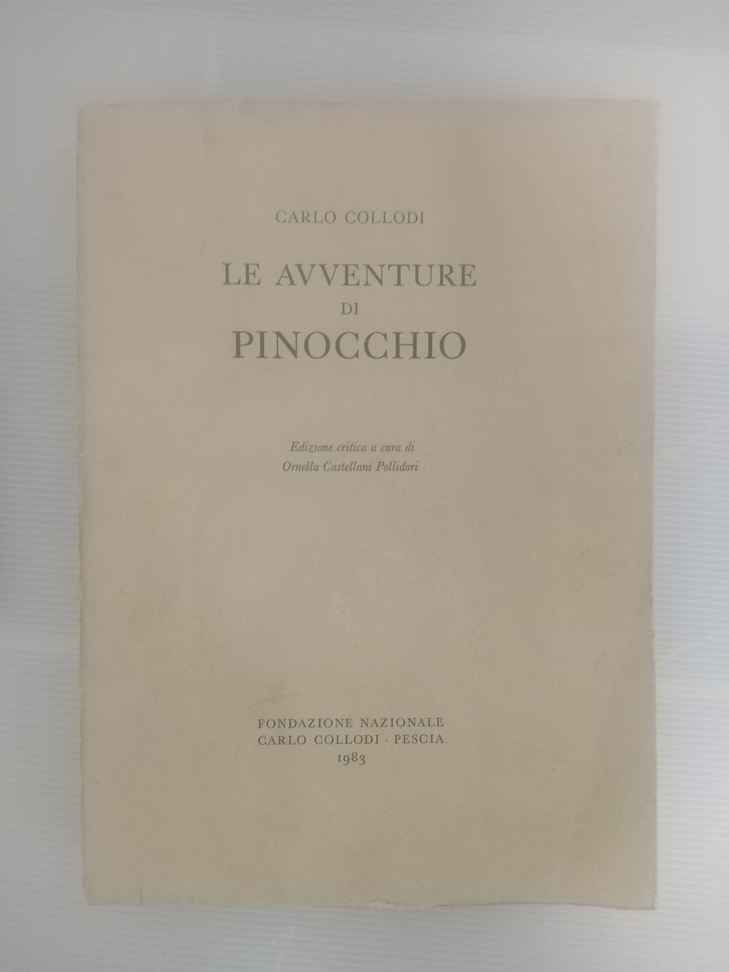 PinocchioDescrizionePescia, Fondazione Nazionale Carlo Collodi, 1983, in-4, br. editoriale, pp. (2), LXXXIV, 281, (3). In appendice: facsimile dell'autografo degli ultimi due capitoli, facsimile di un finale inedito, ed illustrazioni di E. Mazzanti riprodotte dal “Pinocchio” originario. Indice dei nomi ed indice linguistico. Importante edizione critica a cura della Fondazione Collodi, ideata a celebrazione del centenario ed impressa dalla Stamperia Valdonega su carta appositamente fabbricata dalle Cartiere Magnani di Pescia.