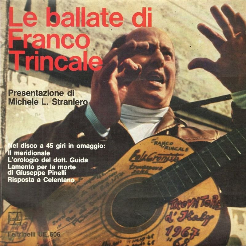 In-8°, carré, legatura in brossura editoriale, pp. 74; con molti testi delle ballate. Allegato un disco 45 giri, con le ballate:- Il meridionale - L'orologio del Dottor. Guida. - Lamento per la morte di Giuseppe Pinelli - Risposta a Celentano. Franco TRINCALE (Militello in Val di Catania, 6 giugno 1935), è un cantante e cantastorie italiano. Trasferitosi a Milano nel dopoguerra, si è esibito per diversi anni nella zona del Duomo e, dal 1992, in Piazza San Babila con testi che facevano eco alle vicende di mani pulite e alla contestazione.