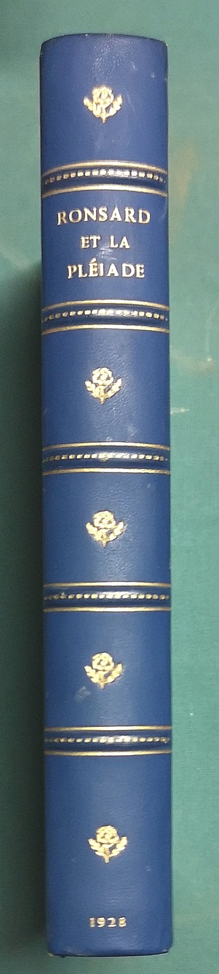 >in-8 broché, pp. 267. Bella legatura d'amatore in m. pelle azzurra, titolo e fregi in oro su dorso a nervi, broch. edit. conservata. Edizione di 2615 esemplari numerati (n. 2298) su carta forte di questa "Recueil de poésies libres, rares ou peu connues, pour servir de Supplément aux Oeuvres dites complètes des poètes français Pierre de Ronsard et la Pléiade." Perfetto esemplare.