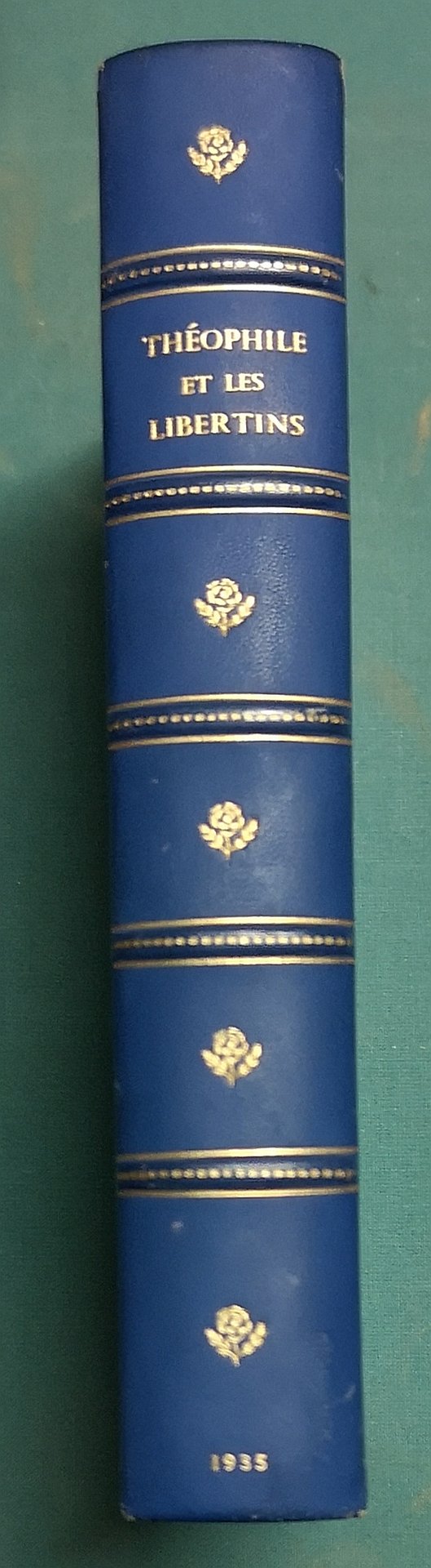 >in-8 broché, pp. 257, bell'antiporta inciso. Bella legatura d'amatore in m. pelle azzurra, titolo e fregi in oro su dorso a nervi, broch. edit. conservata. Edizione di 2650 esemplari numerati (n. 1736) su carta forte di questa "Recueil de poésies libres, rares ou peu connues, pour servir de Supplément aux Oeuvres dites complètes des poètes français Théophile de Viau et les Libertins." Perfetto esemplare.