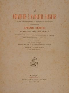 LE CERAMICHE E MAIOLICHE FAENTINE dalla loro origine fino al principio del secolo XVI, Appunti storici., Faenza, Giuseppe Montanari Editore, 1889.