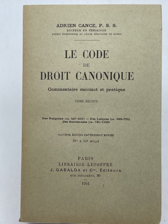 Le Code de Droit Canonique. Commentaire succint et pratique. Tome II seul