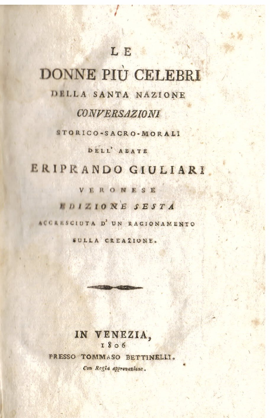 In-8°, pp. 322, (2) di estratto dal catalogo edioriale, cartonatura coeva (dorso rifatto). Qualche gora e fioritura. 'Conversazioni storico - sacro - morali' sulle donne della Bibbia: Eva, Sara, Rebecca, Rachele, Rut, Giuditta, Ester, Susanna. 'Eriprando Giuliari' è lo pseudonimo di Giuseppe Luigi Pellegrini (Verona, 1718-ivi, 1799), abate gesuita e letterato amico di Ippolito Pindemonte che lasciò fra l'altro un noto componimento sepolcrale, 'In morte di Amaritte', dedicato a Marietta de'Medici (sposa del conte Luigi Balladoro, morta a ventidue anni il 12 dicembre 1794) ed imitato dal giovane Foscolo in una sua elegia funeraria del medesimo anno. V., per varie opere dell'autore, Gamba, 2642-2644 e Sommervogel, III, 1477-1478. Cfr. l'elogio del Pellegrini composto da Bartolomeo Giuliari riportato in Giuseppe Pellegrini, Al popolo veronese. Orazione postuma.accresciuta dell'elogio dell'autore scritto dall'abate Eriprando conte Giuliari, Verona, nella stamperia Giuliari, 1800.
