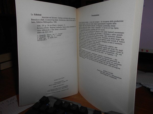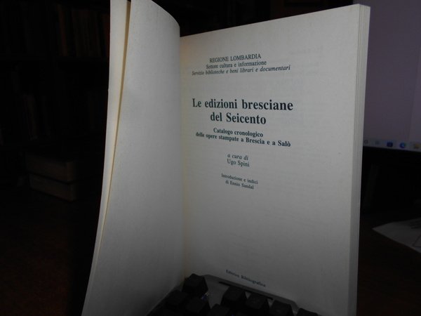 A cura di UGO SPINI. Milano, Editrice Bibliografica, 1988. Regione Lombardia. Le edizioni bresciane del Seicento. Catalogo cronologico delle opere stampate a Brescia e a Salò. In-8°, br. edit. xxii, 231 pp. In ottimo stato di conservazione. Neg. lett. mod. mob. M