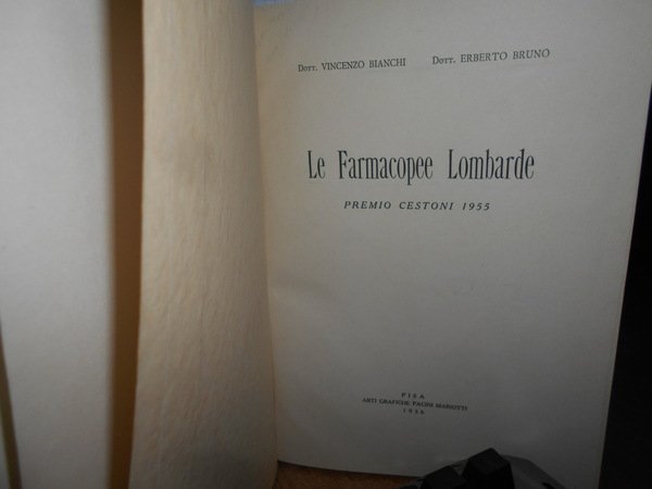 Vincenzo Bianchi - Erberto Bruno. Pisa, Arti Grafiche Pacini Mariotti. 1956. Le Farmacopee Lombarde. Premio Cestoni 1955. In-8° grande, tela con titolo in oro entro tassello al dorso, copertine originali conservate. 103, (2) pp. Perfetto stato di conservazione in legatura recente co le brossure originali conservate. Uff. C - IV - 6 - 2