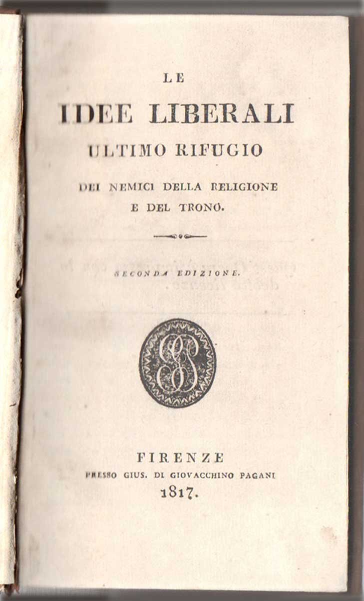 LIBROSeconda edizione.Bell’esemplare con pochi difetti (minime mancanze alla cerniera esterna superiore, lievi escoriazioni al dorso, due buchini di tarlo alla cerniera interna superiore, segno di etichetta rimossa alla prima sguardia, all’interno carte solo lievemente brunite).Pamphlet anti-rivoluzionario e anti-illuminista, con attacchi particolarmente feroci nei confronti di Voltaire e della tolleranza religiosa. Fin dalla «Dedicatoria» al marchese Giovan Battista Carrega, le idee liberali vengono definite «mostruosi principi, che dopo la metà del secolo scorso, e nell’ordine politico, e nell’ordine morale alterarono intieramente l’antica lodevole maniera di pensare» (p. VI). Paolo Vergani, canonico in San Giovanni Laterano, fu studioso di economia politica e di diritto civile ed ecclesiastico.