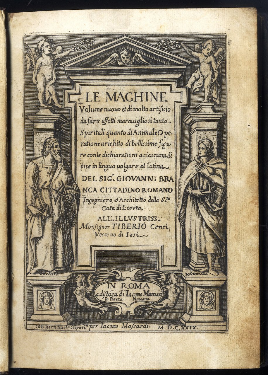 Le Machine. Volume nuovo et di molto artificio da fare effetti maravigliosi tanto Spiritali quanto di Animale Operatione, arichito di bellissime figure con le dichiarationi a ciascuna di esse in lingua volgare e latina. All'Ill. monsignor Tiberio Cenci Vescovo di Iesi.