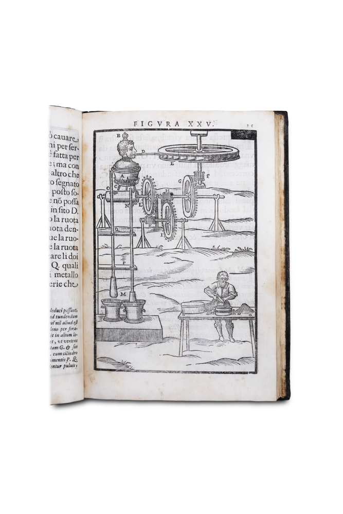 >in-4 (228x156 mm), 80 fogli complessivi in tre sezioni, numerate: (3), 1-40; 1-14; 1-23, leg. coeva in p. pelle, tassello e fregi oro al dorso. Titolo entro bordura architettonica figurata inc. in rame; illustrato da 77 tavole in silografia a piena pagina nel testo al recto di altrettanti fogli, di varie e interessanti macchine. Prima ed unica edizione di grande opera classica di tecnologia del Seicento, l'ultima della trattatistica rinascimentale. Il Branca (1571-1645) si segnalò in opere di architettura a Roma, a Loreto e Assisi, e la presente opera gli assicurò un posto di primo piano tra gli scrittori di trattati scientifici, precursori della tecnica meccanica moderna. Vi espone (fig. 25) la progenitrice delle moderne turbine a vapore ad azione, cioé l'applicazione della potenza espansiva della turbina. Prima ed unica edizione di grande opera classica di tecnologia, l'ultima della trattatistica rinascimentale; le opere analoghe di Zonca e Besson conobbero invece varie edizioni in diverse lingue. Buon esemplare, con lieve uniforme ingiallitura della carta, qualche alone. Dibner, Heralds of Science 175. Riccardi I, 188-9: «Raro e ricercatissimo». Horblit 172. Wheeler Gift 96. Cultura delle macchine p. 46 e 90. Manca alla Hoover Coll. e al Cat.Vinciana.