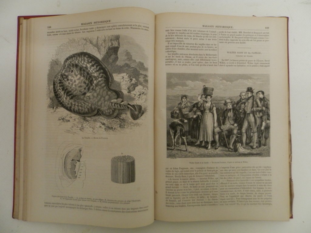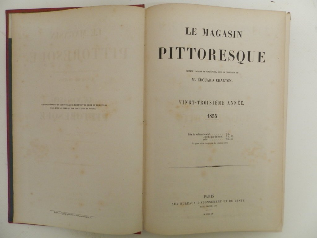 4°, mm 290x190, pp. 412, al fondo tavola delle materie, testo in francese su doppia colonna, ricco di incisioni in legno, fascicoli rilegati in tutta tela rossa titolo impresso in oro al dorso, buon esemplare, normali lievi bruniture. Edito dal 1833 al 1938. Il nome “Magasin” esprime proprio l'eclettica selezione degli argomenti trattati, è stata una sorta di enciclopedia popolare attenta soprattutto alla storia l'archeologia, le scienze e le industrie.. *** TUTTI I NOSTRI LIBRI SONO VISIBILI PREVIO CONTATTO MAIL O TELEFONO NELLA NUOVA SEDE DI MILANO: LIBRERIA COSMOPOLIS, VIA JOMMELLI, 22. ***