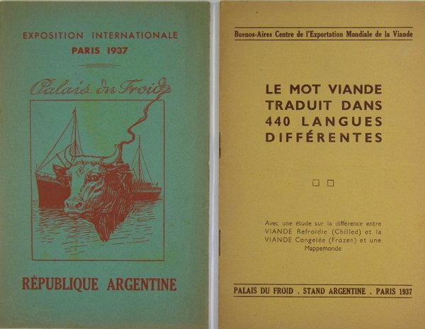 Chambre de Commerce Argentine, Paris, 1937. Plaquette in/8 couverture imprimée, 19 p. Jointe une plaquette sur la viande, également éditée par la République Argentine et traitant des valeurs nutritives de la viande, anecdotes historiques ; illustrations.Intéressante plaquette éditée à l’occasion de l’exposition internationale de 1937.
